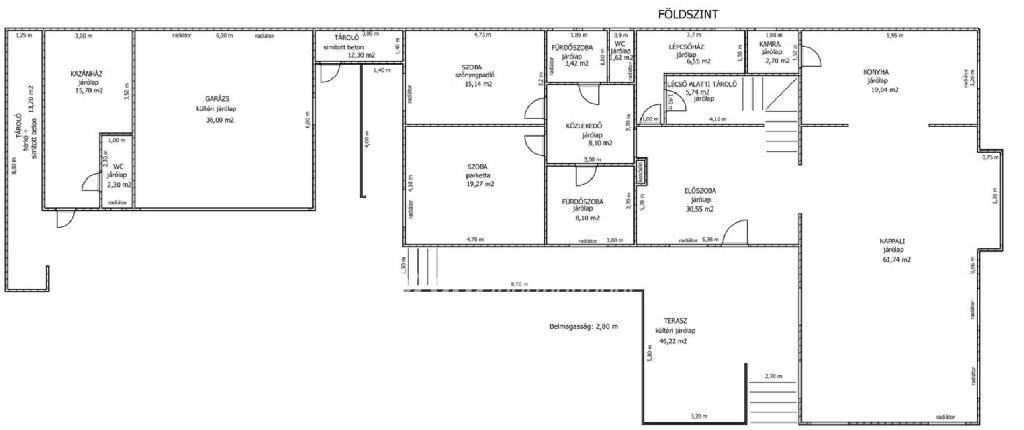 A földszinten található: Nagy méretű fedett terasz, egy nagy méretű napfényes nappali, konyha, előszoba, kettő fürdőszoba, kettő nagy szoba, közlekedő, lépcsőház és tárolók.