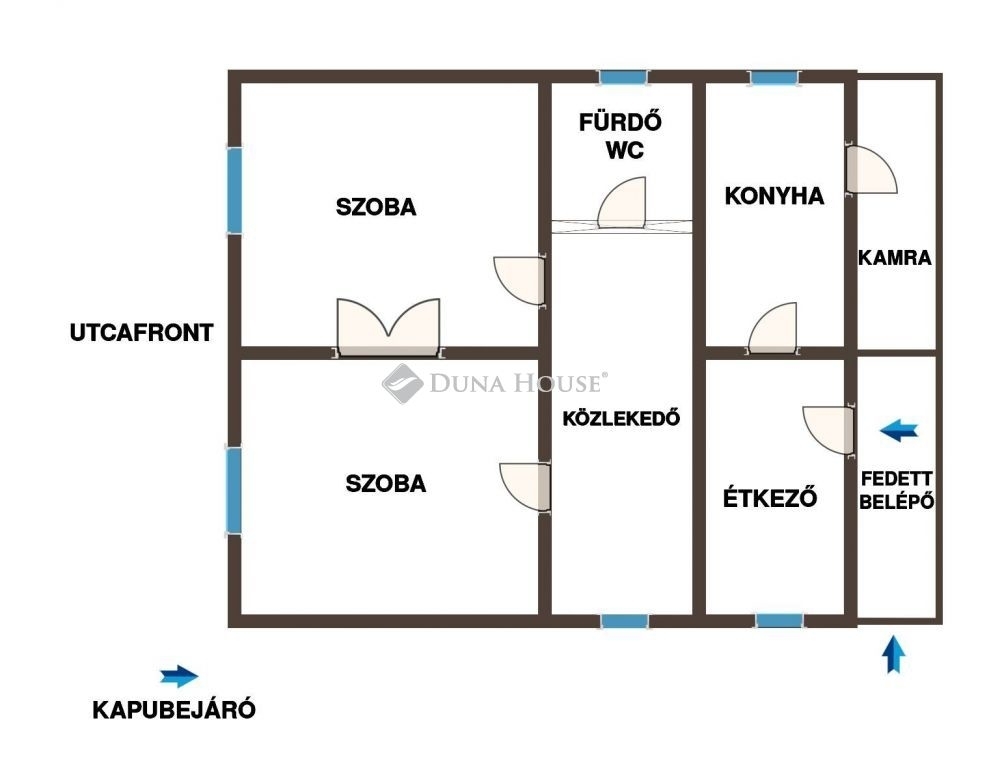 Helyiségek: Két szoba, konyha, étkező, előtér, közlekedő, fürdő-wc