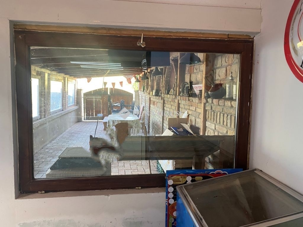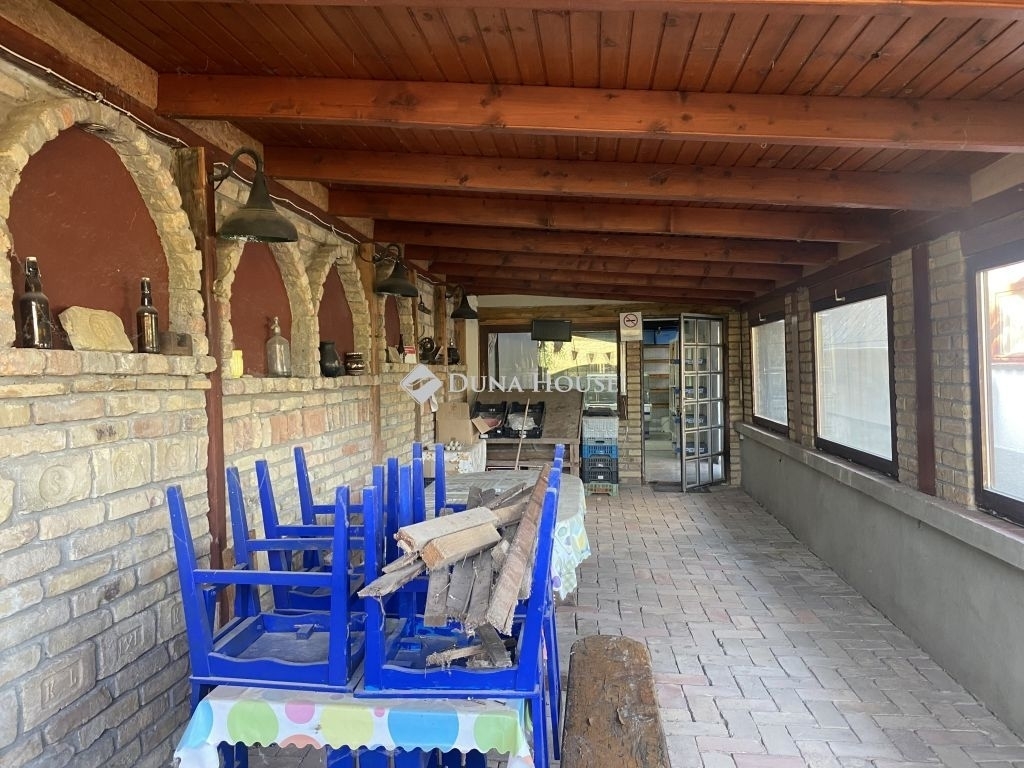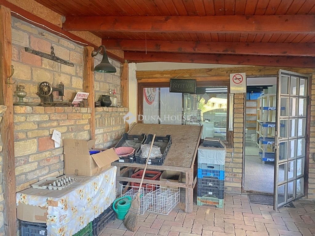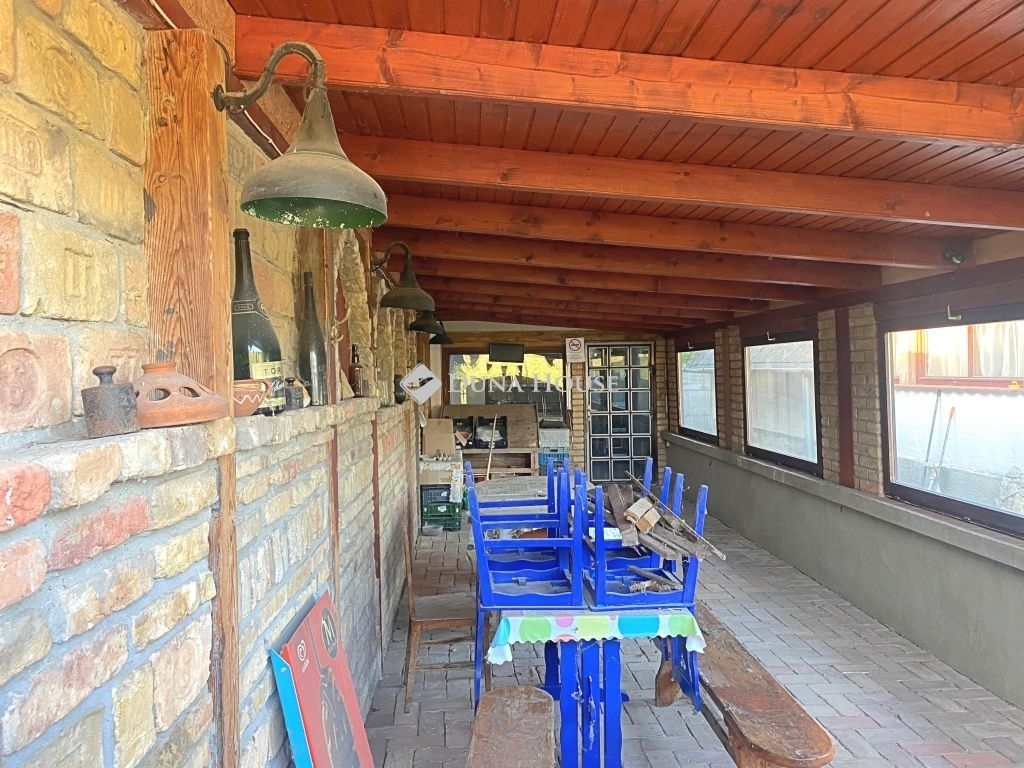 Látvány hűtővel, polcrendszerrel felszerelt kis vásárló tér, felette zárt, ablakos alvó galériával jelenleg tároló. 3 oldalról beépített tégla falazatú, címeres téglákkal díszített, térkövezett aljzattal , 1 oldalról ablakokkal ellátott hatalmas terasz.