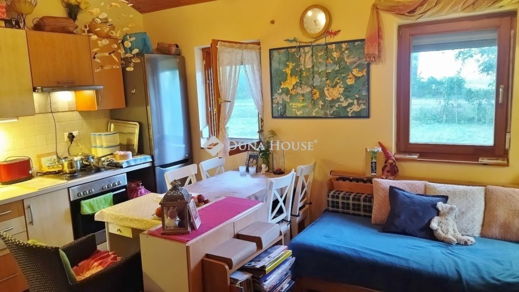 A nyaraló téglából épült 2013-ban, 10 cm homlokzati szigeteléssel, kiváló minőségű nyílászárókkal, jelenleg elektromos fűtőpanelekkel téliesítve. A központi elhelyezkedésű kéménynek köszönhetően egy kandallóval az egész ház gazdaságosan fűthető. A meglévő 45 m2-es épülethez kapcsolódik egy 100 m2-es kész alap, melynek megvannak a beépítési tervei, ahogy az alaprajzon látható. A sarki elhelyezkedésű telek 587 m2-es, arányos méretű (kb 24x24m), a két utcáról nyíló bejáratnak köszönhetően a telek és a két épület használati megosztással külön választható, így több lehetőséget is magában rejt: