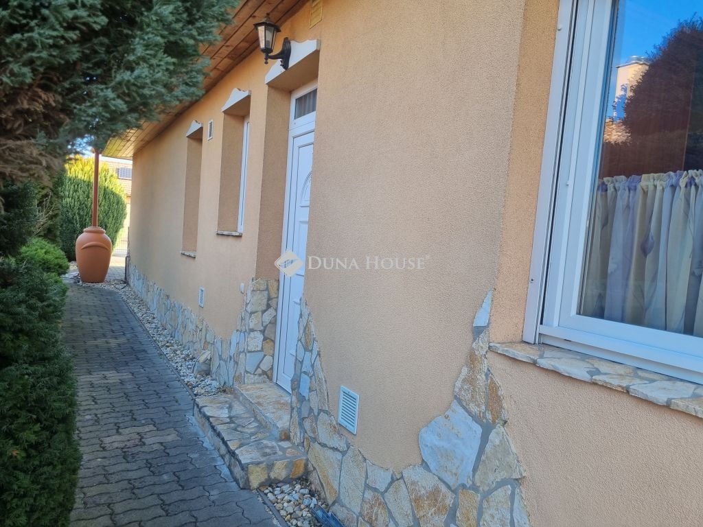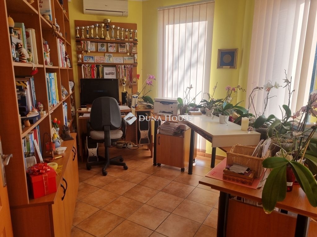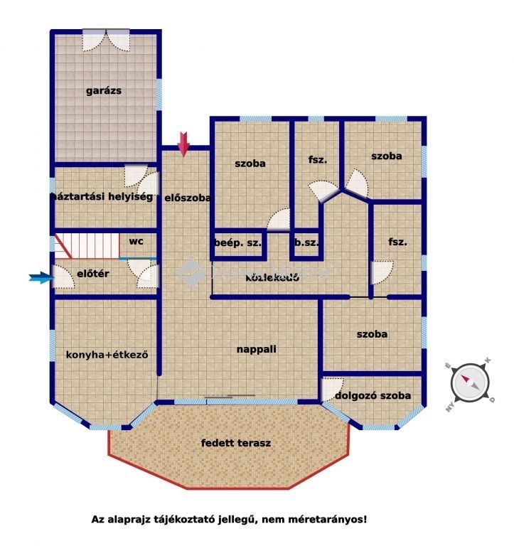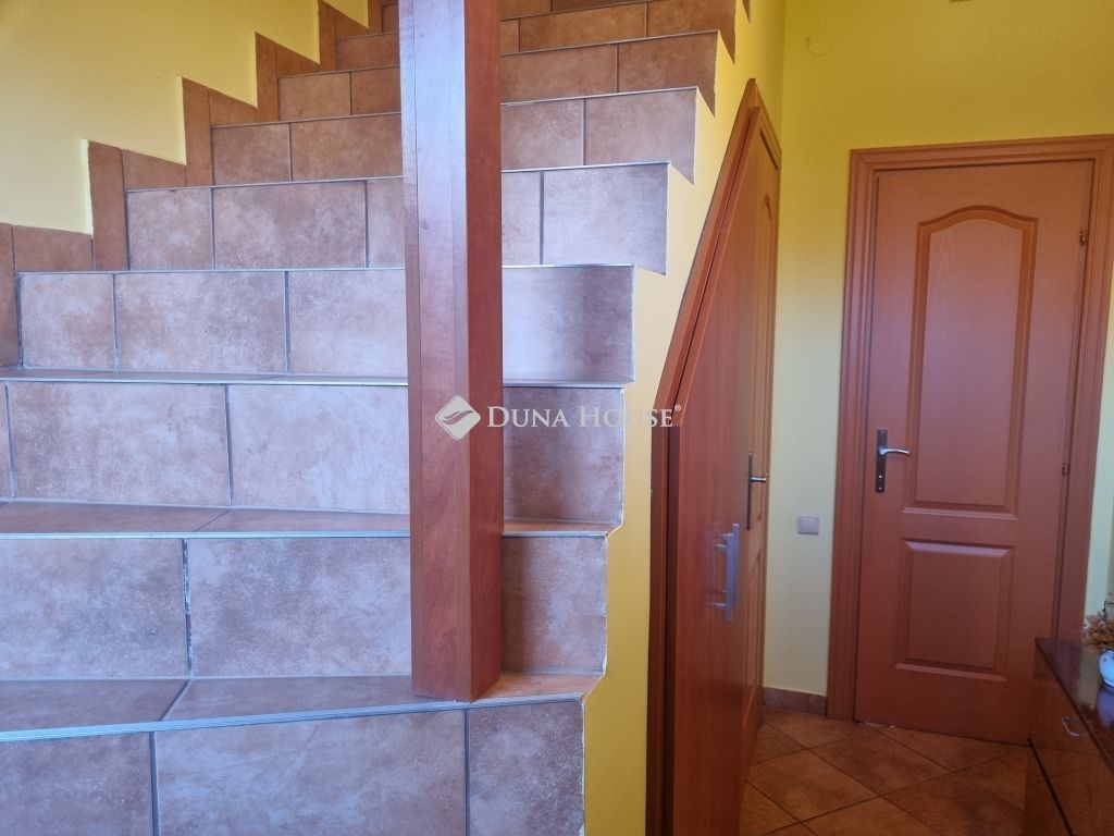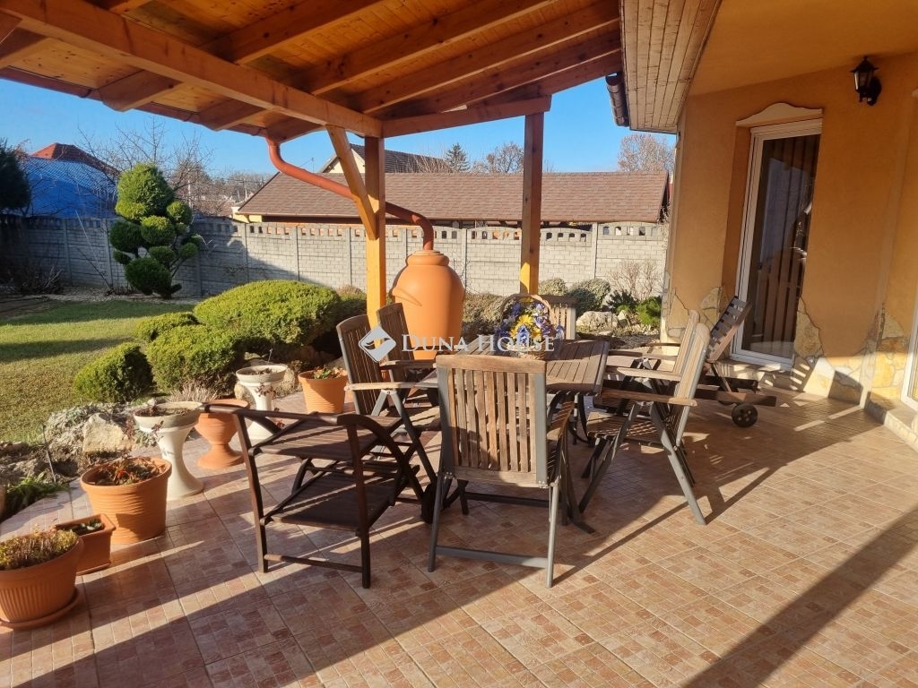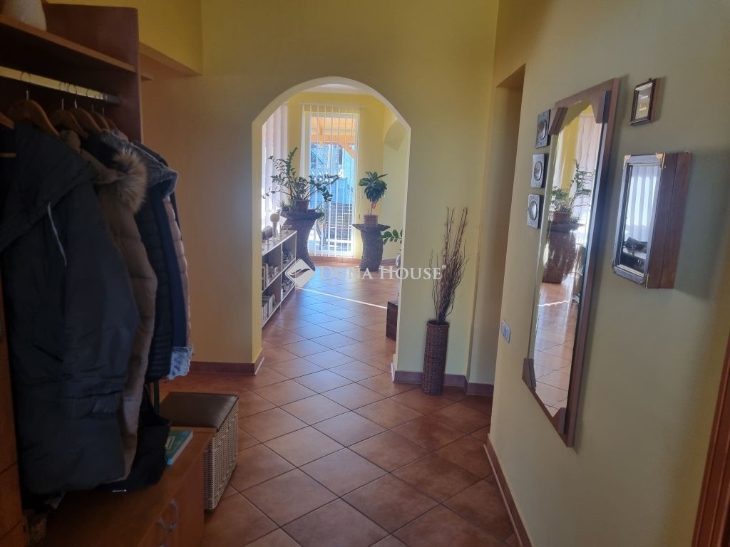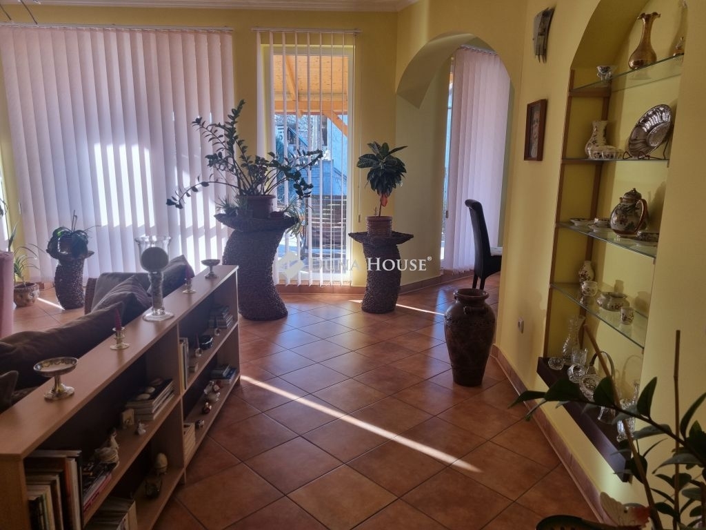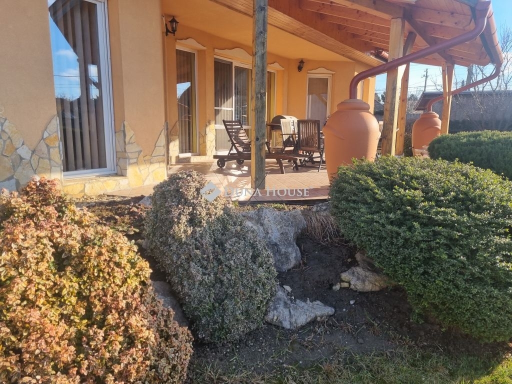 helyiségei : előtér, nappali, konyha+étkező, háztartási helyiség, 3 szoba, 1 dolgozó szoba,2 fürdőszoba, hatalmas fedett terasz, a tetőtérhez tartozó bejárat, külön wc, előszoba, lépcsőtér, garázs