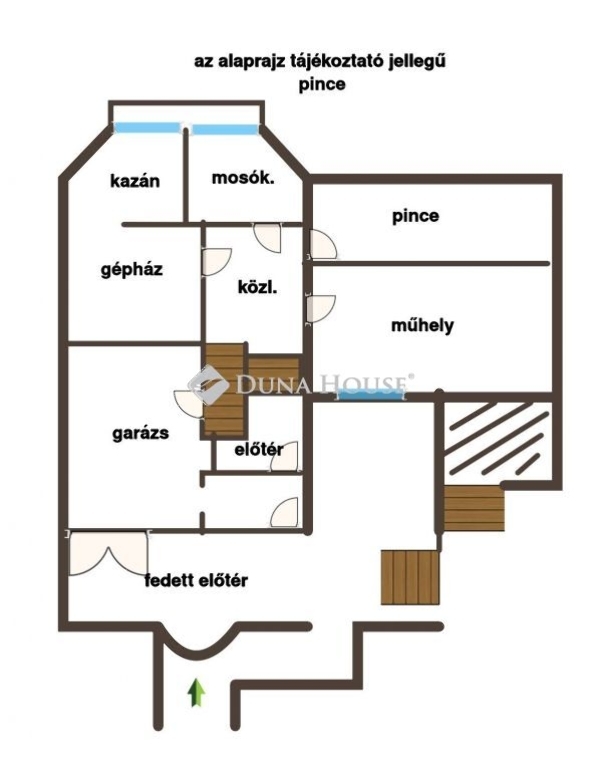 Ezen a szinten helyezkedik el egy fedett előtér, szélfogó, wc/kézmosóval, előtér, garázs, közlekedő, műhely, mosókonyha, kazánház és a pince.