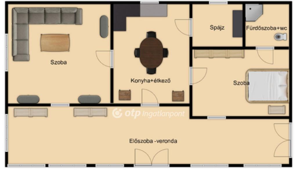 -a világos beltérben : előszoba-veronda , 2 szoba , konyha , spájz , fürdőszoba+wc helyezkedik el.
