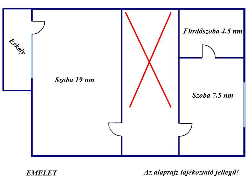 Az emeleten szintén egy 19 nm-es szoba és egy kisebb 7,5 nm-es szoba található, valamint a fürdőszoba wc-vel.