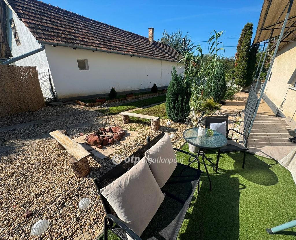 Udvara rendezett, parkosított, körbekerített, rajta kerti csap, bográcsozó.