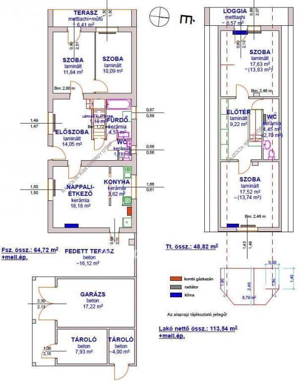 Helyiségek: földszint: 2 szoba, fürdő, WC (külön), konyha, nappali-étkező, előszoba, tároló (64,72 m2), terasz; tetőtér: 2 szoba, előtér, WC-mosdó (48,82 m2), loggia; melléképület (garázzsal).