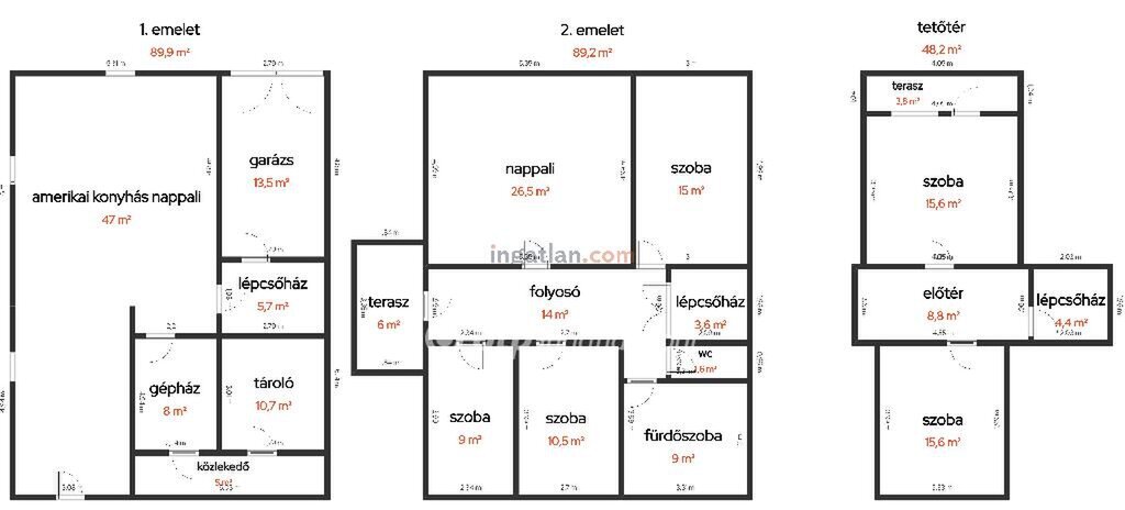A földszinten található egy tágas, 47 m2-es amerikai konyhás nappali, garázs, lépcsőház, tároló, gépház és közlekedő. Az első emeleten nappali, három külön nyíló szoba, fürdőszoba, folyosó és külön WC kapott helyet. A tetőtérben két szoba, előtér és egy terasz található.