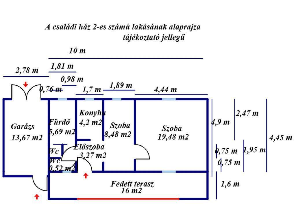 A családi ház 2-es számú lakása nettó 43,2 m2, melyhez tartozik egy 16 m2-es terasz és egy 13,6 m2-es garázs. A lakrész kettő szobából, egy előszobából, egy konyhából, egy közlekedőből, egy fürdőszoba- WC helyiségből, egy különálló WC helyiségből, egy teraszból és egy garázsból áll. A szobák laminált padló-, az összes többi helyiség járólap burkolatot kapott. A lakás melegvíz ellátását villanybojler biztosítja. A fűtés gázkonvektorral megoldott.