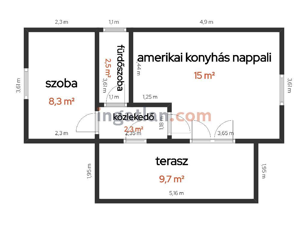Beosztás: 1 szoba, amerikai konyhás nappali, előszoba, fürdőszoba
