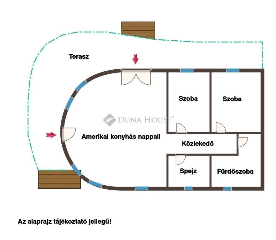 -lakóterület: 80 m² (amerikai konyhás nappali, 2 szoba, spejz, fürdőszoba)