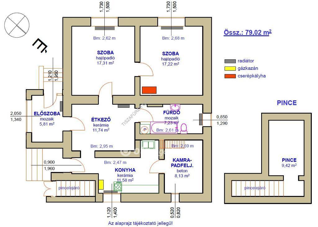 Helyiségek: 2 szoba, közlekedő, konyha-étkező, kamra, fürdő, WC, tároló.