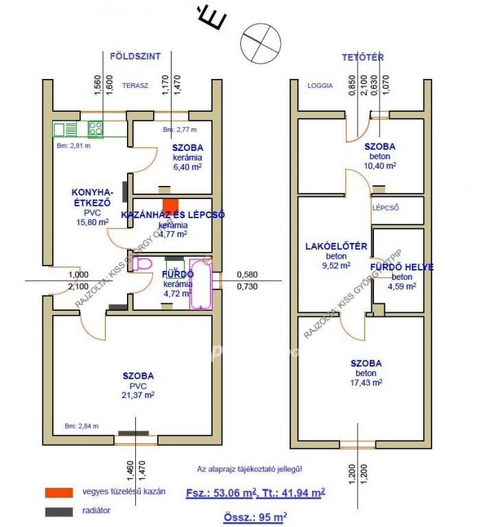 Helyiségek: földszint: 1 szoba, 1 félszoba, konyha-étkező, fürdő (WC-vel egyben), fűtő-lépcső; tetőtér: 2 szoba, fürdő helye, lakóelőtér.