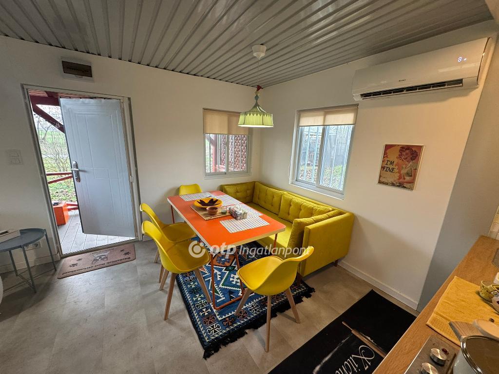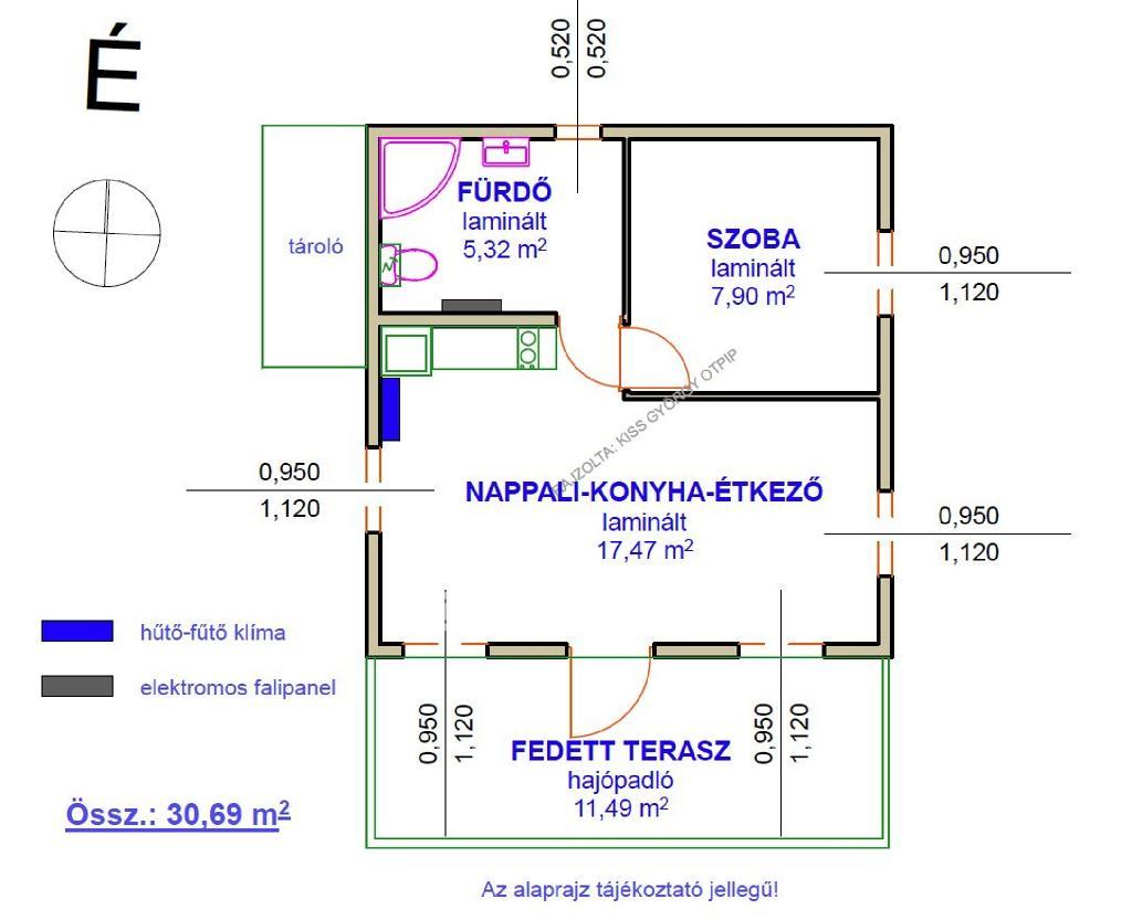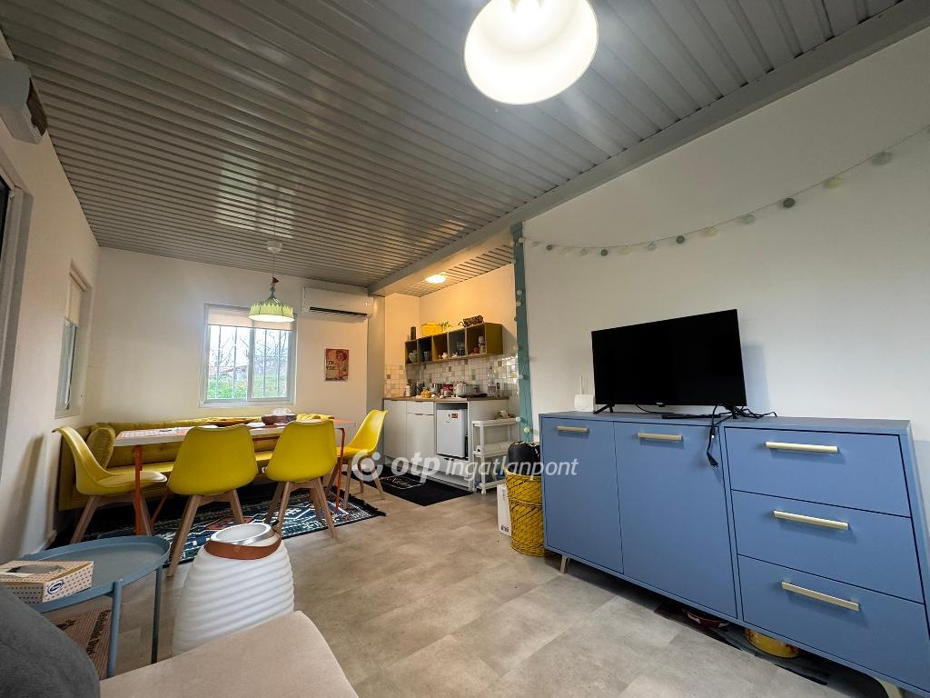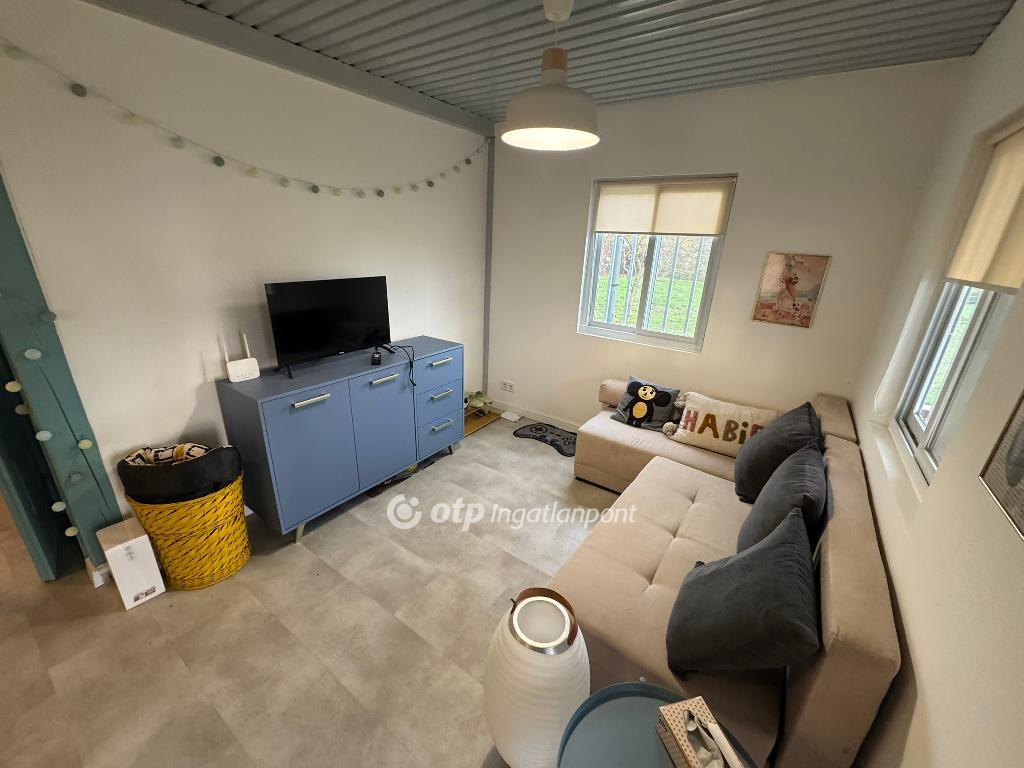 Helyiségek: 1 félszoba, 1 nappali (konyhával, étkezővel), fürdő (WC-vel egyben), tároló, fedett terasz.
