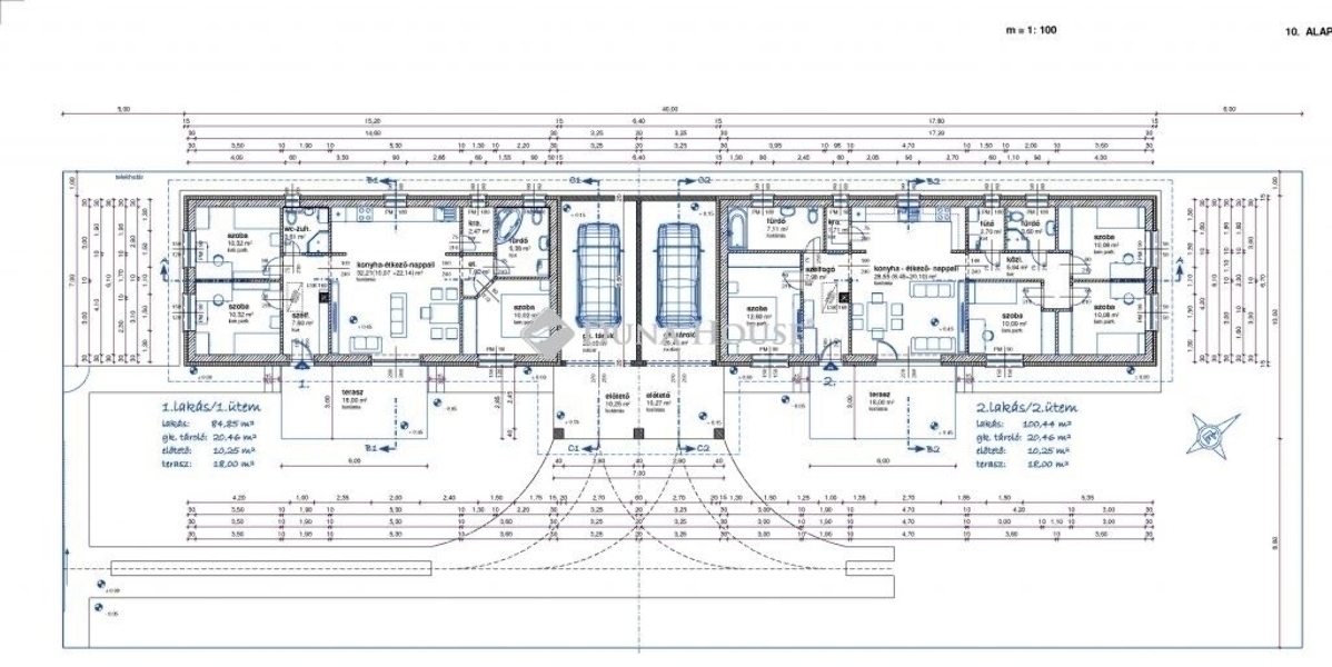 Az ikerházak CSAK GARÁZZSAL kapcsolatosak. A garázs 20,46 m2-es, ahol nem csupán egy autó fér el kényelmesen, hanem bőven van hely bicikliknek és tárolásnak. A garázs előtt egy praktikus előtető található 10,25 m2-en, így sosem kell eláznia a garázsból ki/beállásnál.