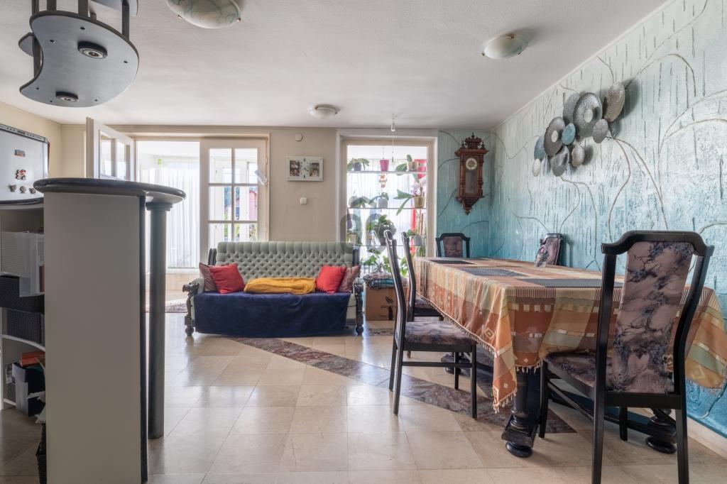 A közel 26 m2-es nappali–étkező nagy ablakfelületekkel rendelkezik, rendkívül világos, közvetlen kapcsolata van a kert felé.