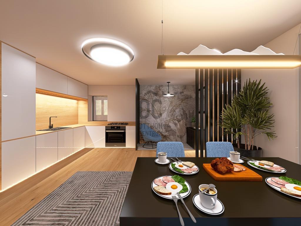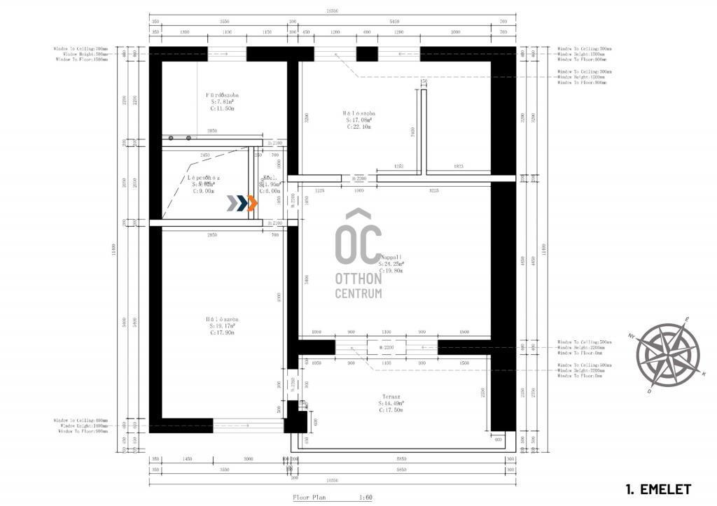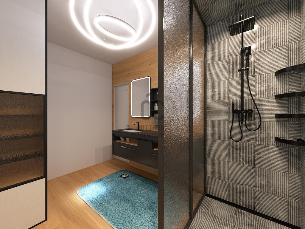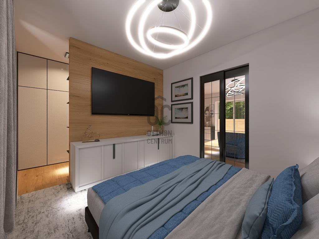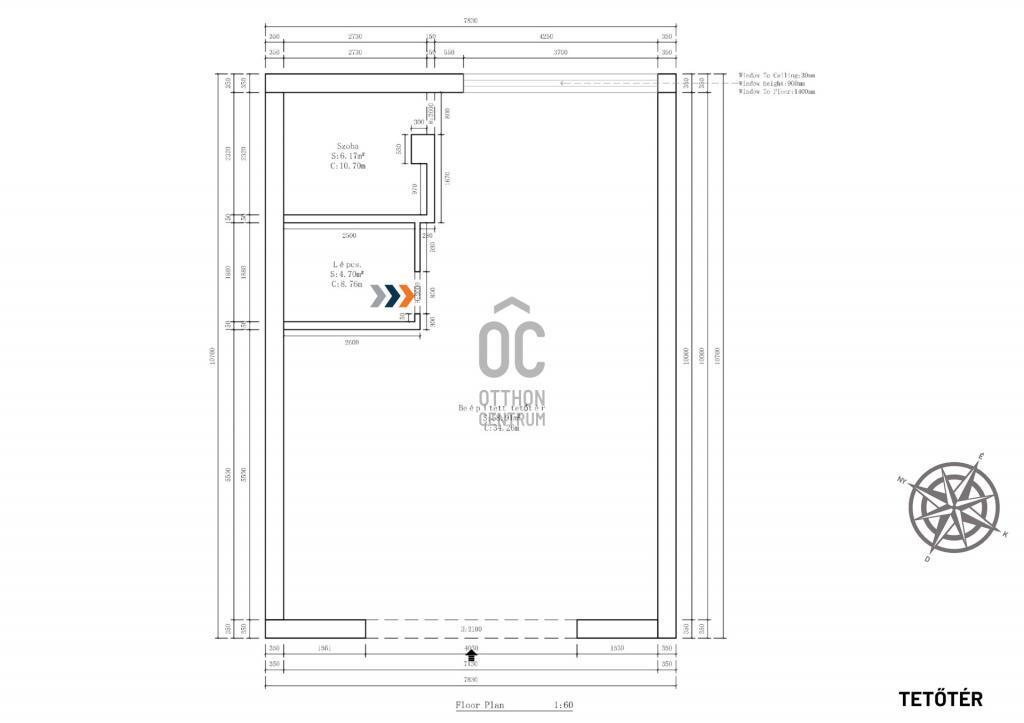 Felosztása: tágas nappali–étkező, háló- vagy dolgozószoba, gardrób, háztartási/gépészeti helyiség, konyha, zuhanyzós fürdőszoba, szauna, közlekedő, előtér.