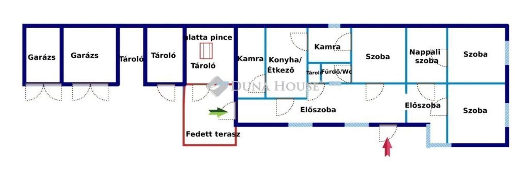 A főbejárat a fedett teraszon keresztül vezet egy tágas előszobába. Innen balra nyílik a konyha-étkező, melyből egy nagyobb kamra/tároló lett kialakítva. Jobbra is található egy másik nagy kamra, mely akár még szobává is alakítható.
