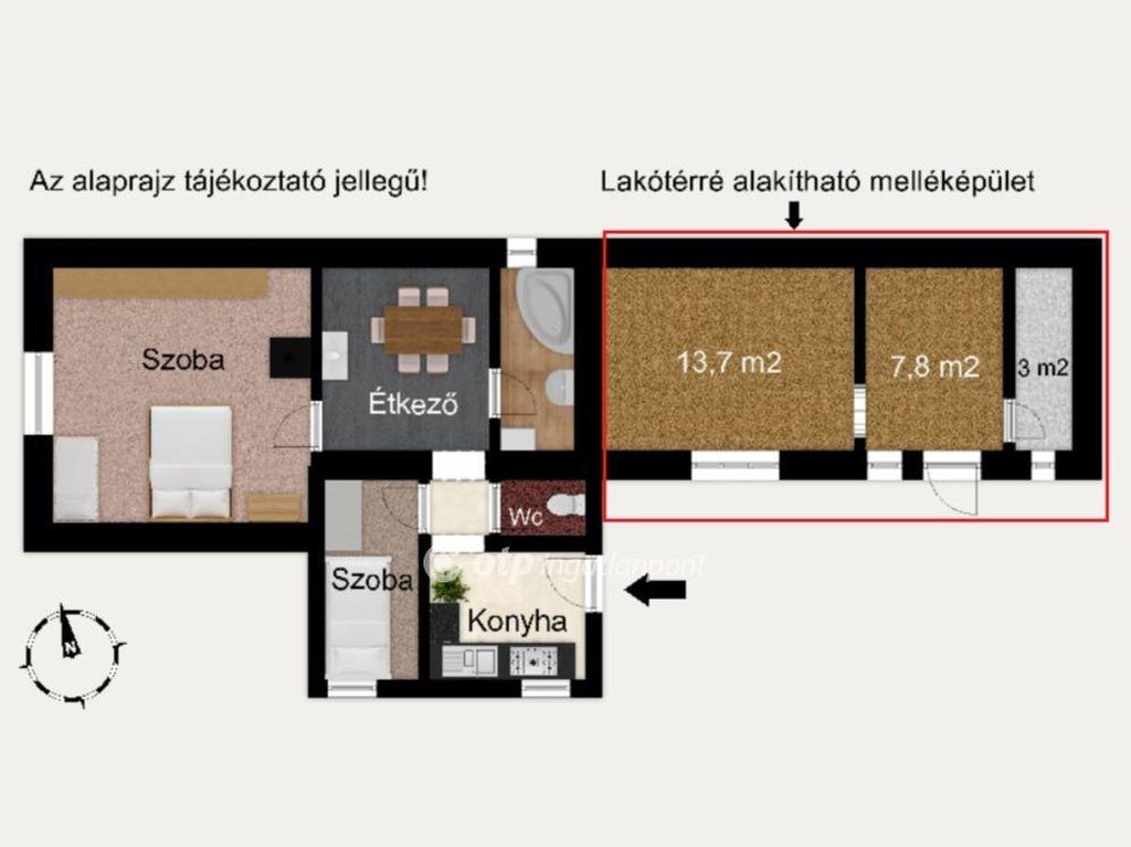A házhoz közvetlenül hozzáépítésre került egy lakhatási célra alkalmassá tehető 25 m2-es melléképület. Bővítéshez ötlet a fotók között található (alternatív alaprajz).