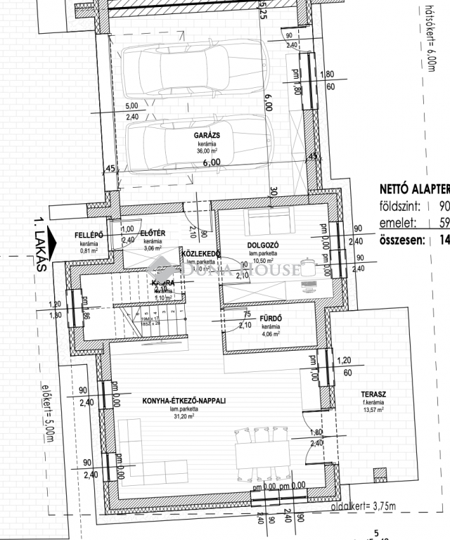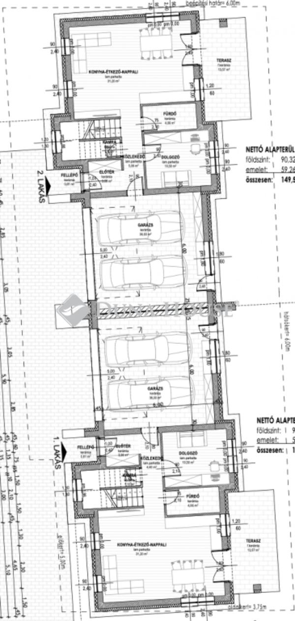 Az ikerház mindkét feléhez egy kétállásos garázs tartozik (36nm), a két ingatlan kizárólag itt érintkezik!