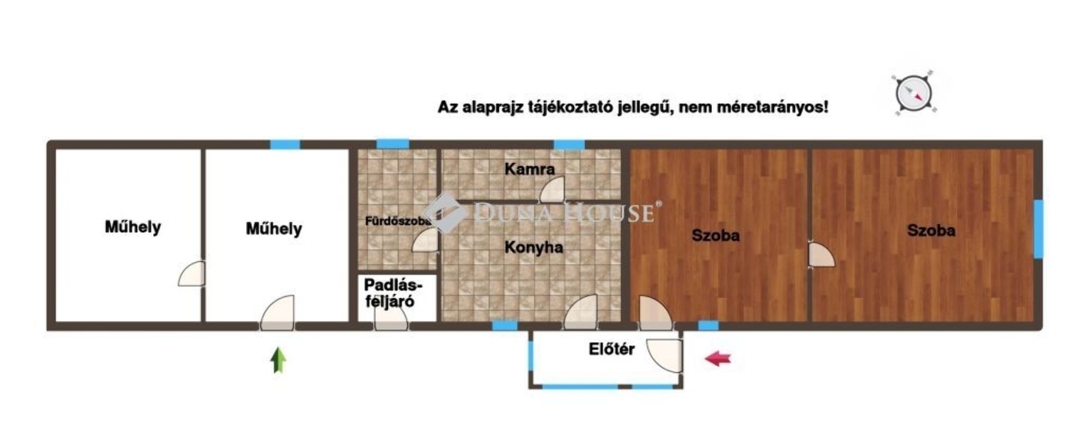 A ház 2 szoba, (20 és 16 m2) étkezős konyha, kamra, fürdőszoba, és előszobából áll. Belmagasság 289 cm!