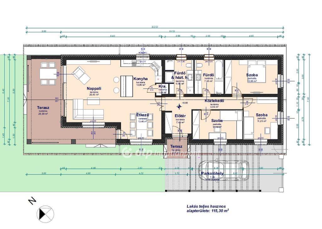Amerikai konyhás, 50 m2-es nappali?étkező?konyha, 3 hálószoba, 2 fürdőszoba, háztartási helyiség, kamra, előtér, közlekedő, + 30 m2-es fedett terasz.