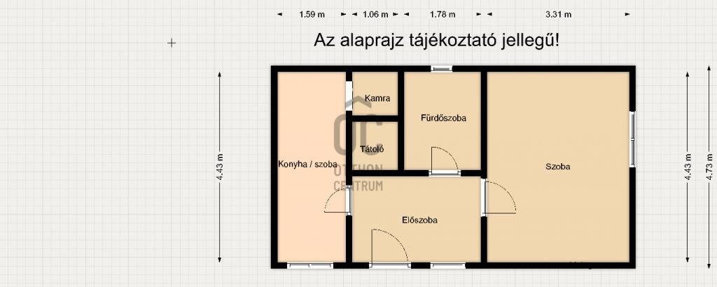 Eredetileg egy szoba, konyha ,fürdőszoba,WC, előszoba volt kialakítva, jelenleg két szoba fürdő+WC, előszobaként van használatban.