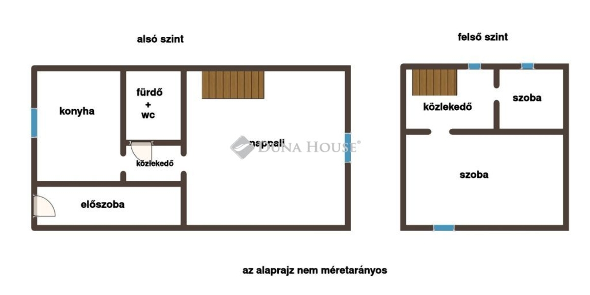 - Alsó szint: nappali, konyhaétkező, fürdőszoba WC-vel, előszoba, közlekedő