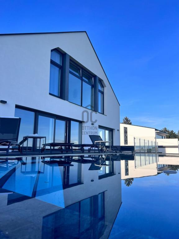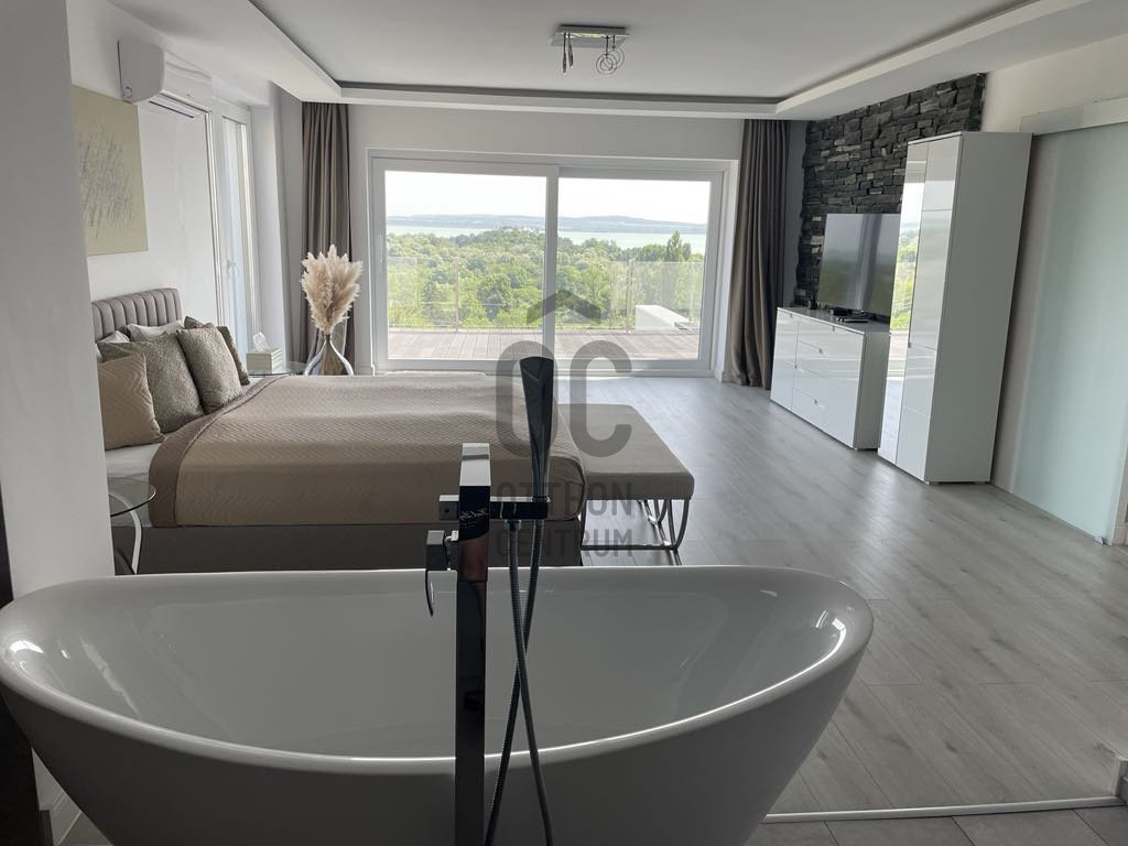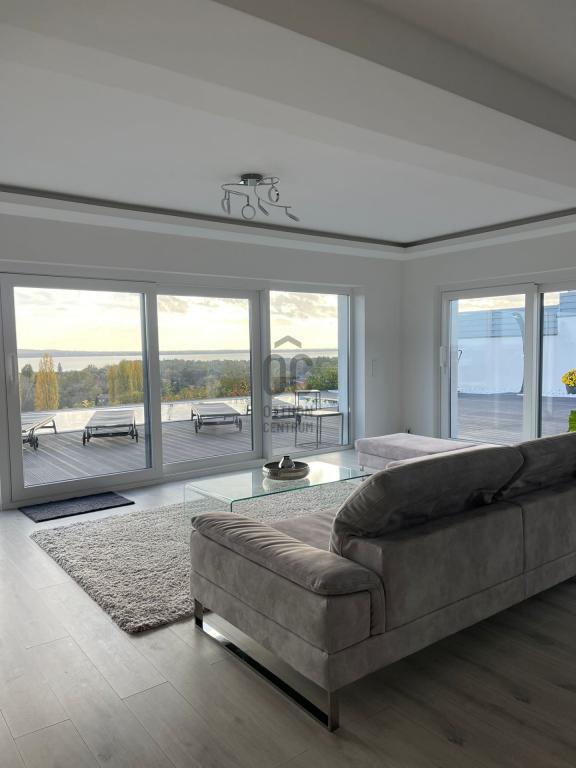 Lélegzetelállító panoráma, tágas terek és modern elegancia – ezek a jellemzők határozzák meg ezt a kivételes, újszerű, örök balatoni panorámás villát.