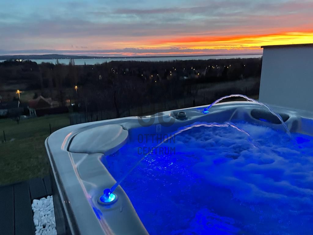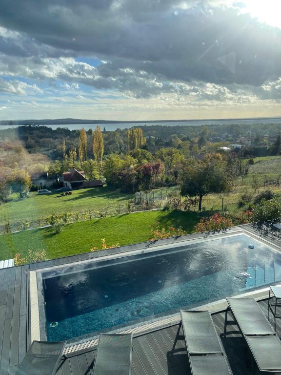 Von der 150 m² großen, sonnigen Terrasse eröffnet sich ein unvergleichlicher Blick auf den Balaton, den man auch aus dem beheizbaren Infinity-Pool genießen kann – der perfekte Ort zum Entspannen oder für gesellige Stunden mit Familie und Freunden.