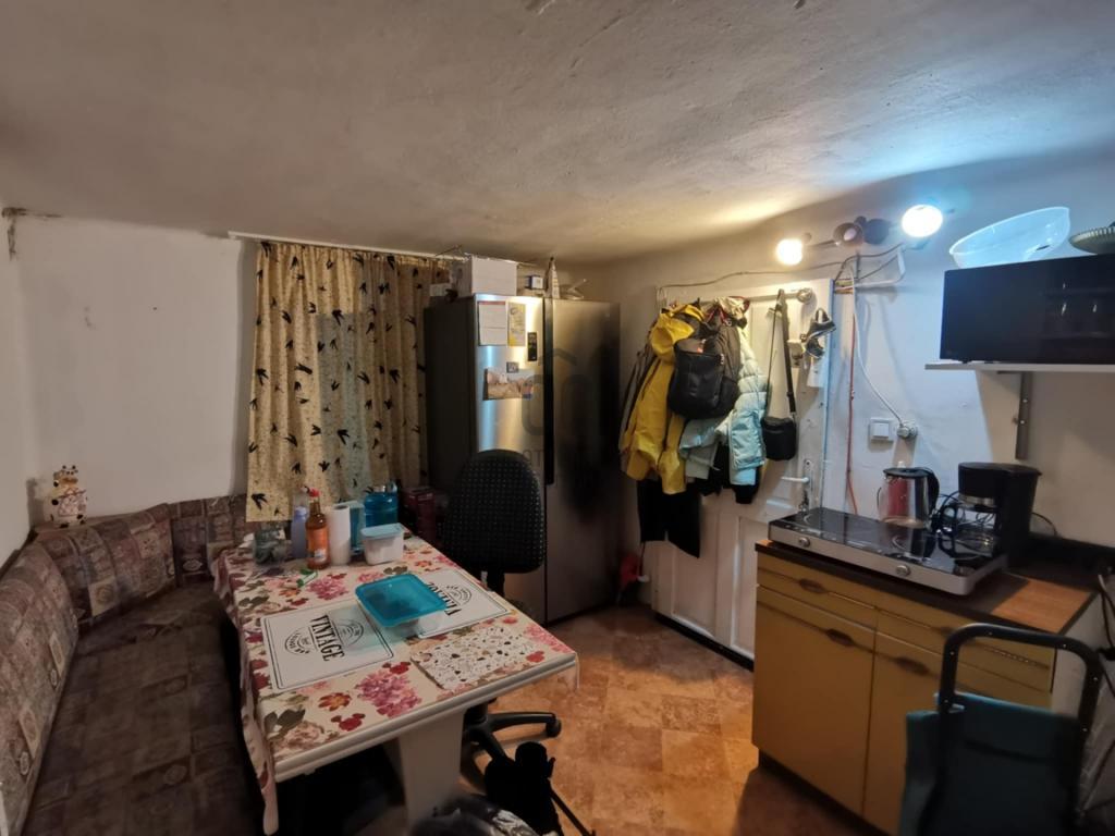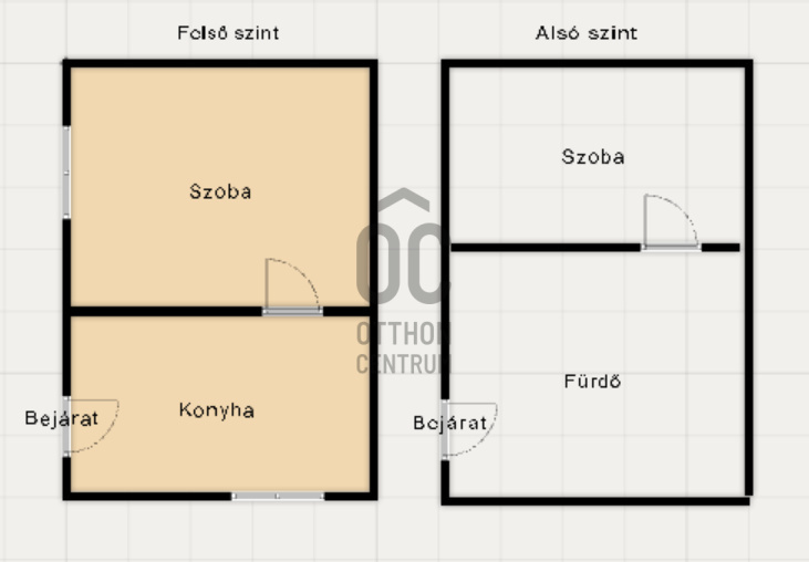 Felső szinten található a konyha és a szoba, alsó szinten a fürdőszoba és egy kis méretű helység.