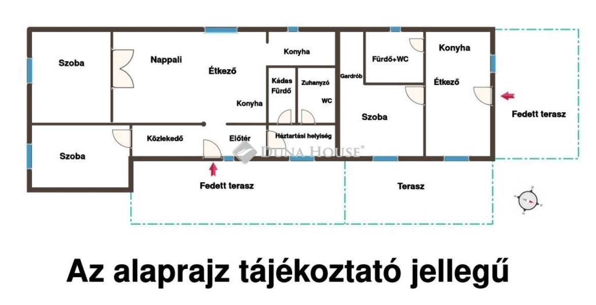 75 nm: amerikaikonyhás nappali étkezővel, két hálószobával, főzőkonyhával, háztartási helyiséggel, két fürdőszobával (egyik csak kádas, a másikban zuhanyzó, mosdó és WC, altestmosó).A nappaliban klíma található, a ház összes nyílászárója szúnyoghálós műanyag. 47 nm-es fedett teraszról lehet belépni a lakásba.