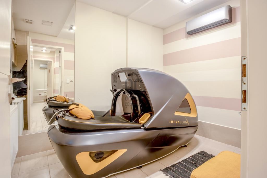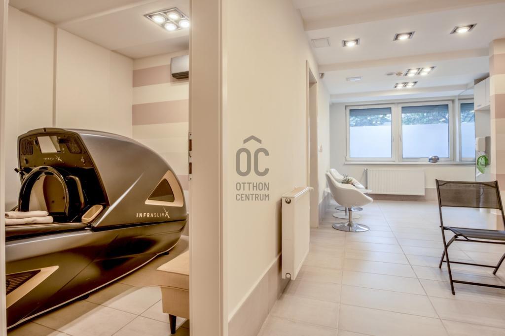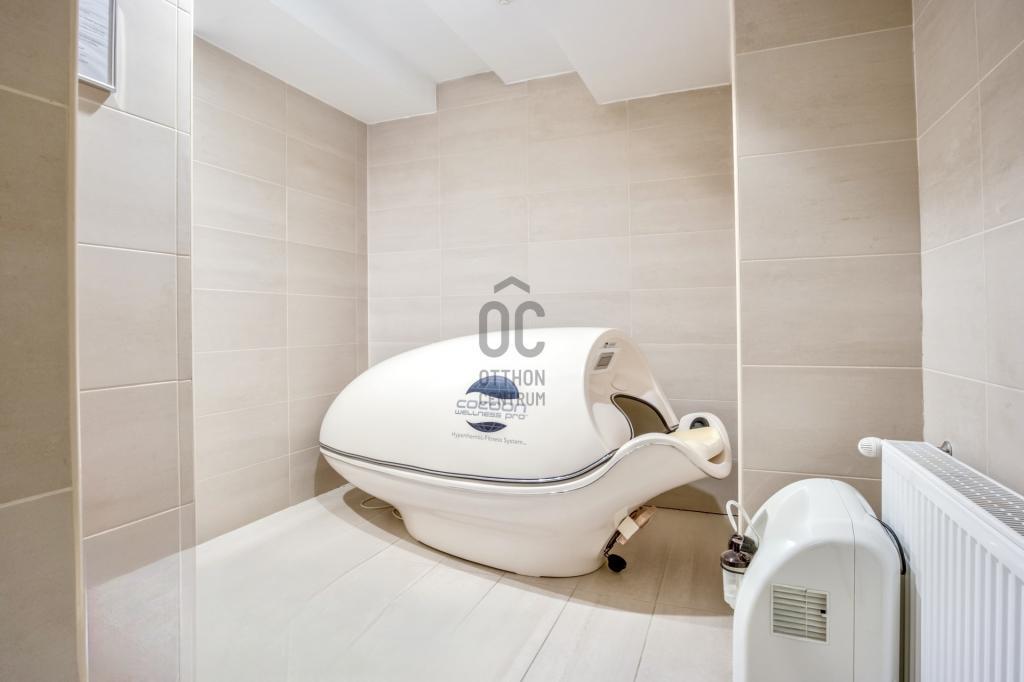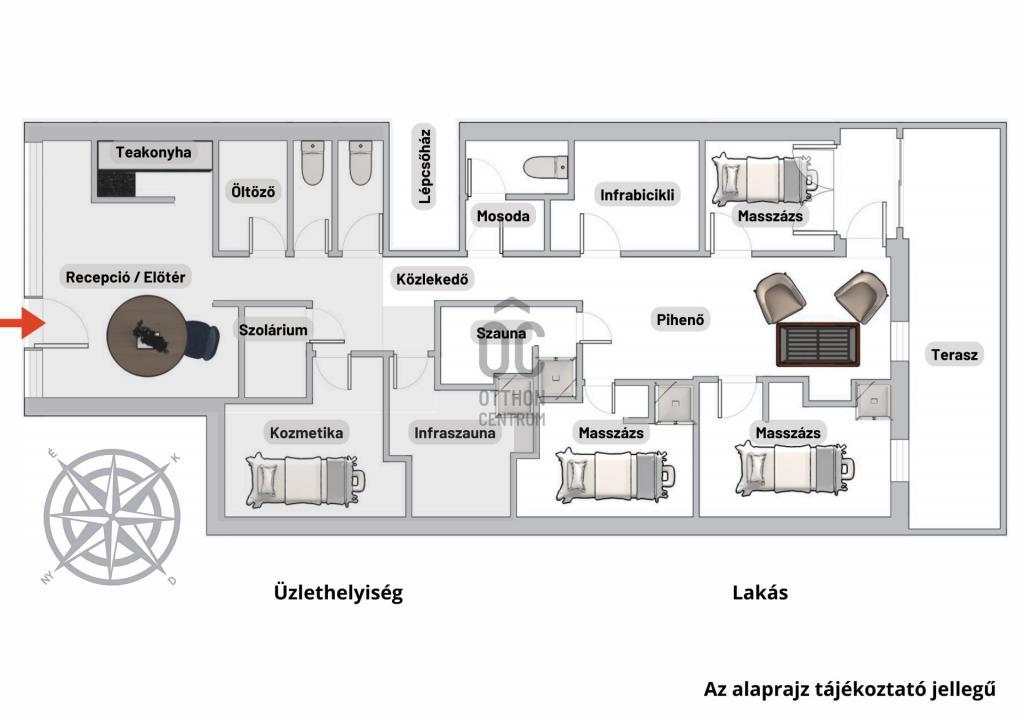 Felosztása jelenleg: recepció/előtér, teakonyha, öltöző, 3 toalett, közlekedő, 6 kezelő helyiség, szauna, szolárium helyiség, pihenő, terasz.