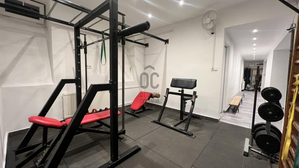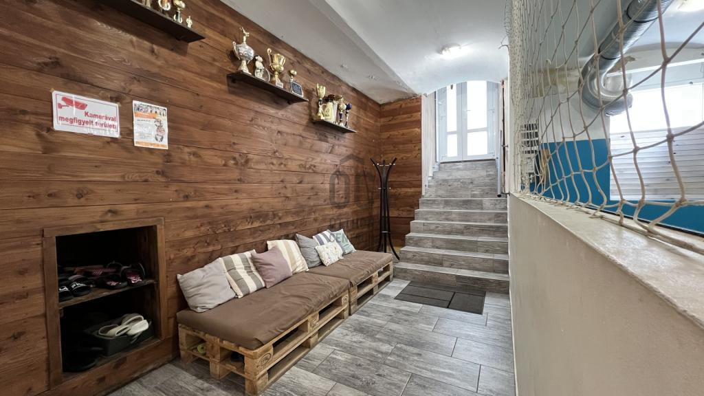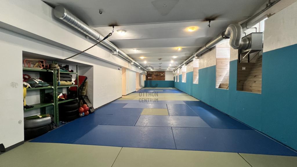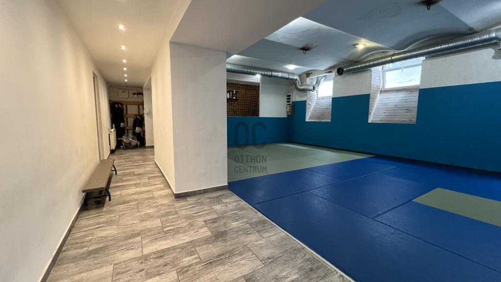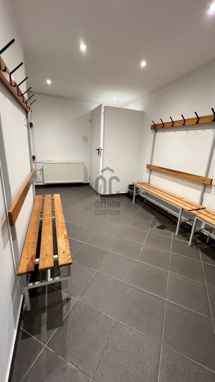 Tágas, 110 m²-es egyterű helyiség (korábban edzőteremként használt), öltözőkkel, mosdókkal és mellékhelyiségekkel.