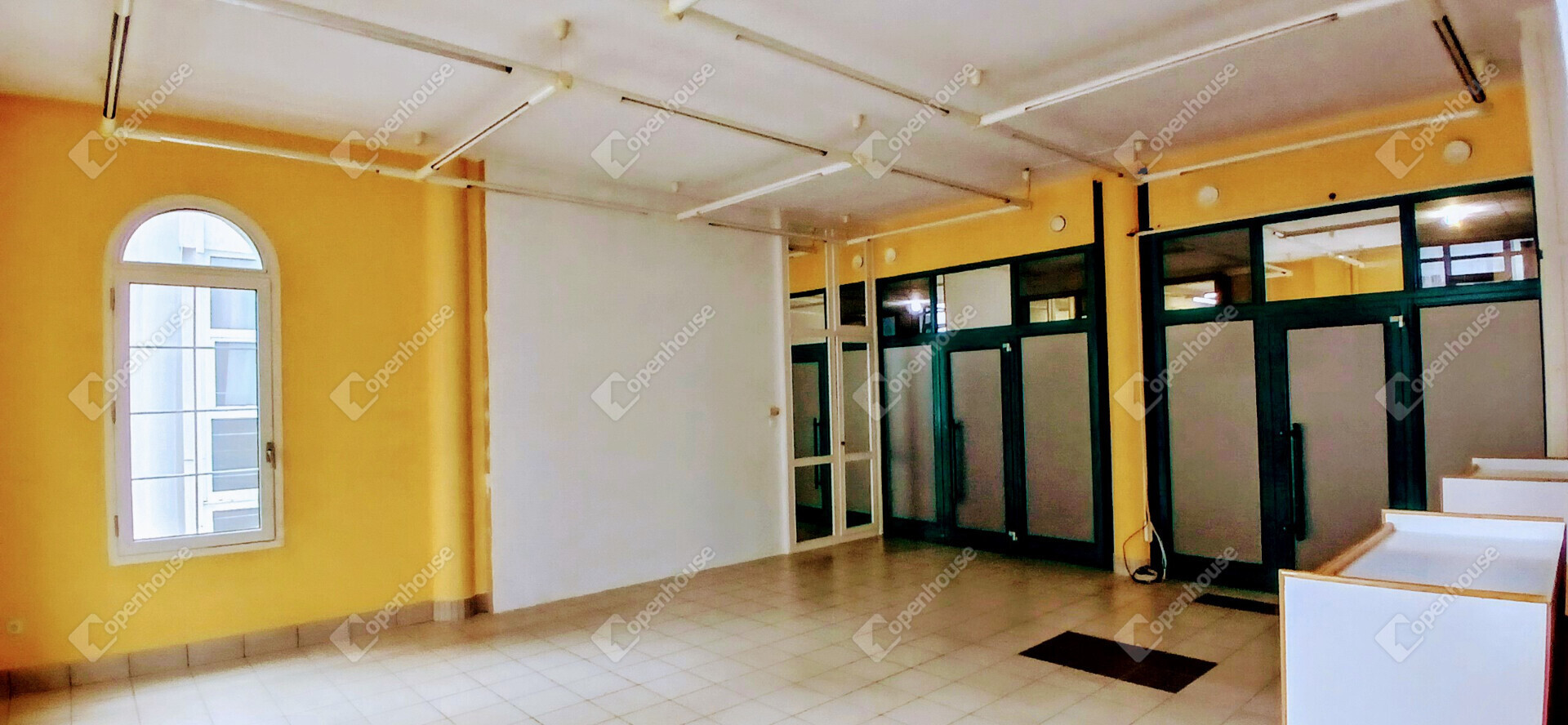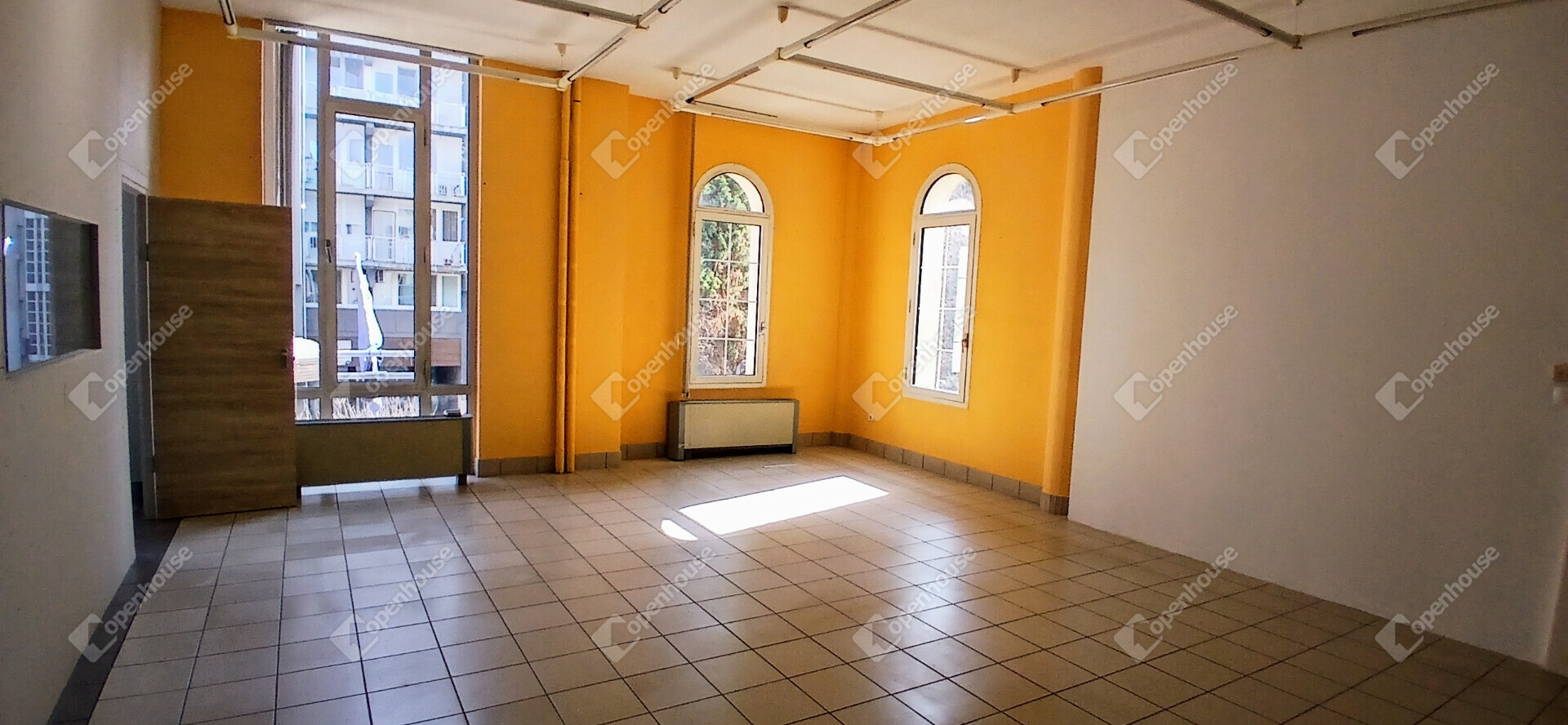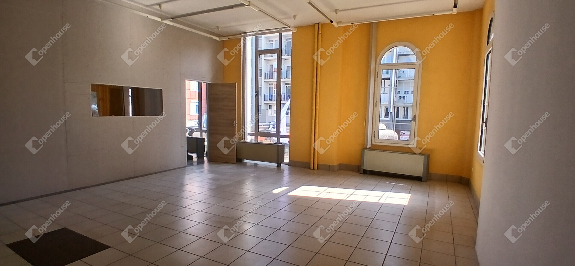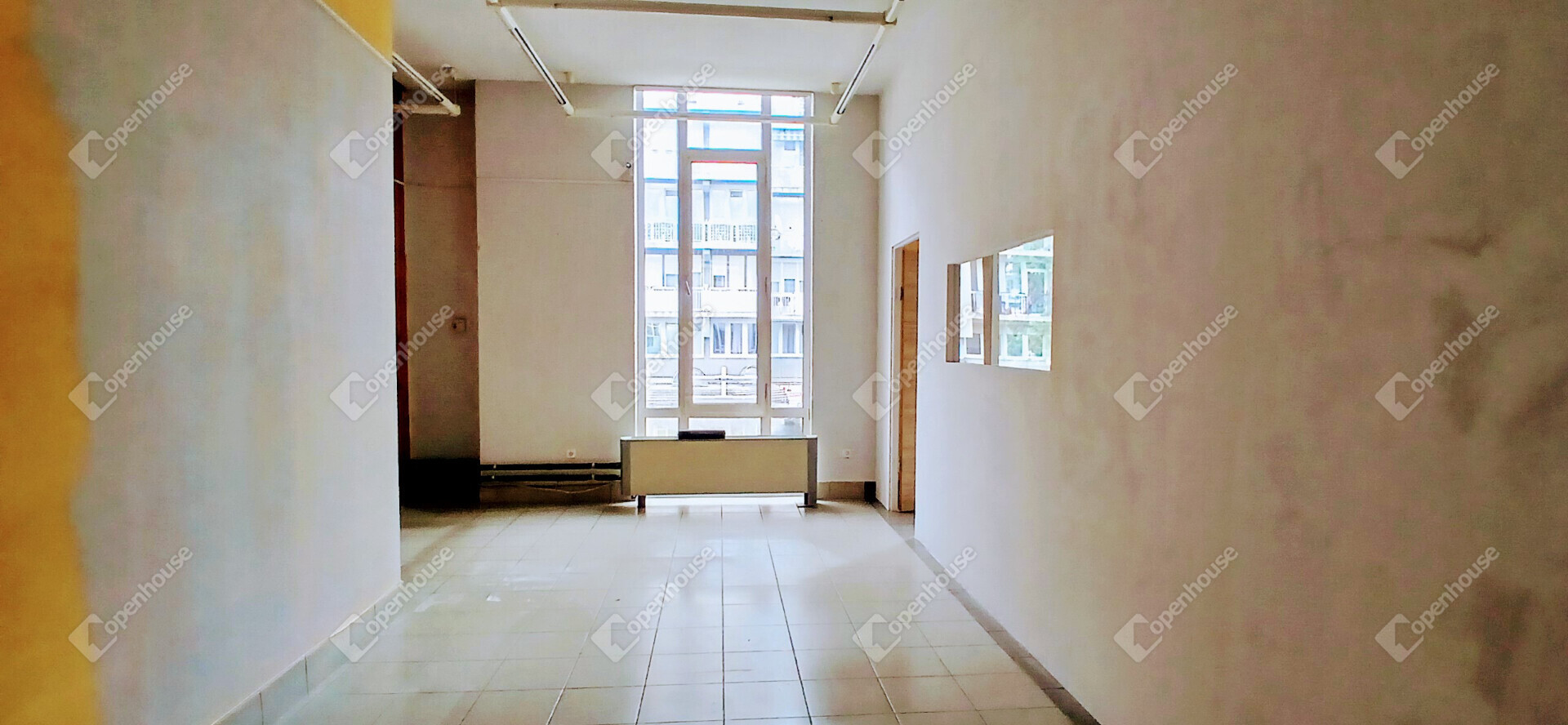 Az ingatlan az emeleti szinten helyezkedik el, hatalmas ablakfelületekkel, amelyek természetes fénnyel árasztják el a teret.