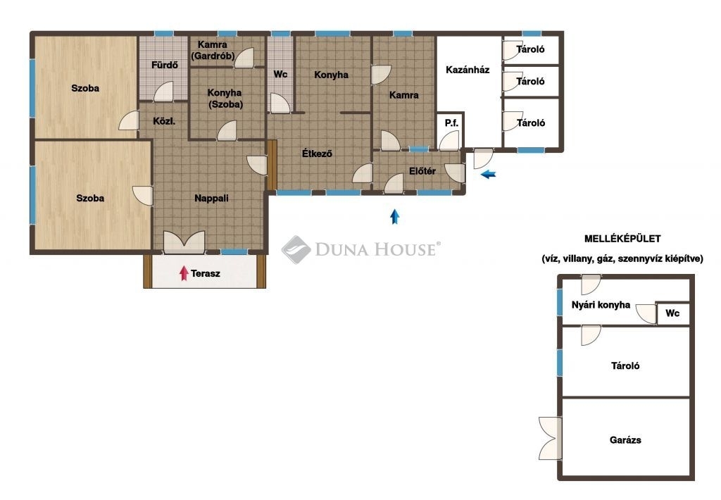 A telken található egy melléképület, amelyben garázs, nyári konyha, tároló és WC kapott helyet. A melléképület is teljes közművel rendelkezik (víz, villany, gáz, szennyvíz).