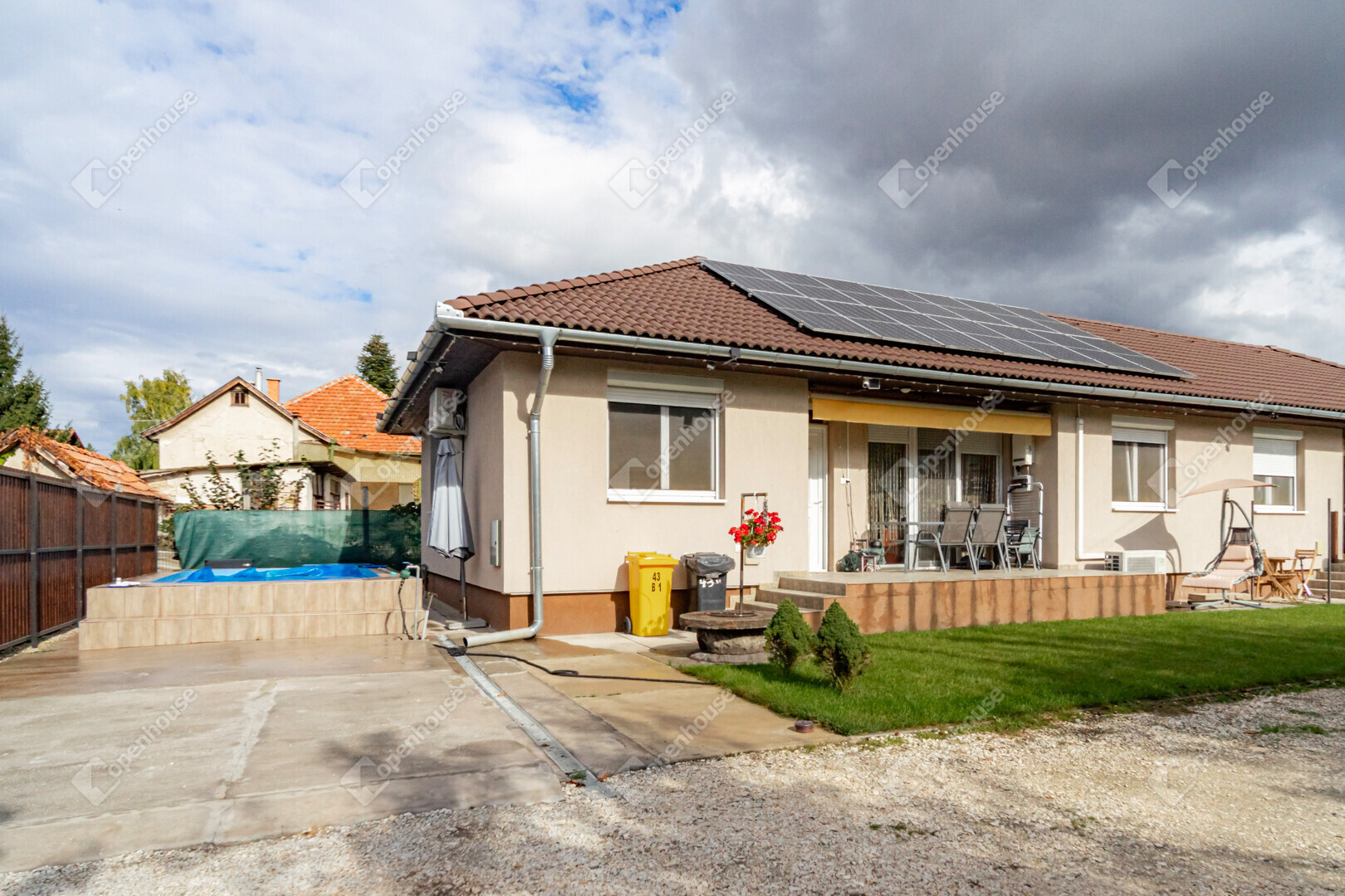 Az igazi különlegességet a saját kert adja, ahol egy fűtött, sóbontóval és világítással valamint masszázsfúvókákkal felszerelt medence várja a tulajdonosokat. A 2,5 × 4,5 méteres medence római lépcsővel és paddal készült, így egyszerre szolgál sportolási és pihenési lehetőségként. A kerthez kapcsolódó terasz felett motoros, szélérzékelős napernyő biztosítja az árnyékot a forró nyári napokon.