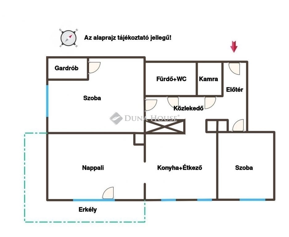 Az ingatlanban tágas amerikai konyhás nappali, 2 hálószoba, gardrób, fürdőszoba wc-vel, kamra, előtér, valamint egy 13 négyzetméteres erkély került kialakításra.