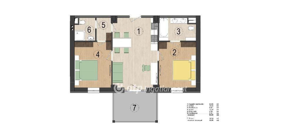 Az ingatlan 60,56 m2 lakótérrel rendelkezik, amelyhez egy 10,34 m2-es terasz kapcsolódik.