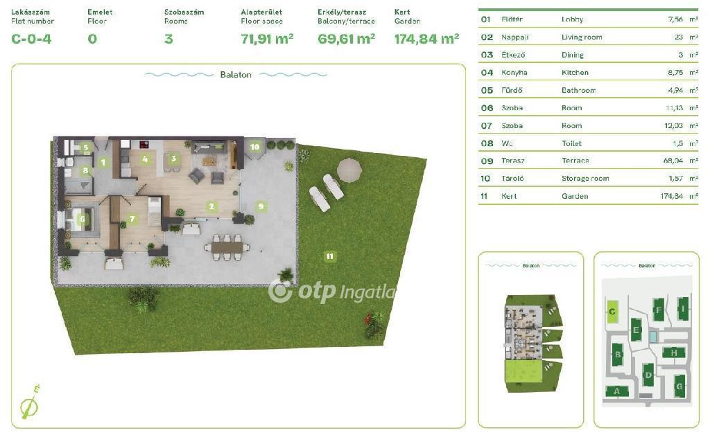Balaton Déli part, Balatonszemes, közvetlen vízparti, 106 m2 lakás eladó. Az ingatlan a Balaton egyik legszebb vízparti lakóparkjában, természetes zöld környezetben található. A környezettudatosan épült, panorámás kilátást nyújtó, modern épületek esztétikailag és a fenntarthatóság szempontjából is kiemelkedőek, egyszerre biztosítják a kényelmes otthont és a balatoni életstílust. A különböző lakástípusok lehetőséget adnak arra, hogy minden lakó megtalálja a számára tökéletes otthont, akár az Otthon Start Hitelprogram keretében is. A földszinti lakások terasszal és kertkapcsolattal rendelkeznek, az épületek felső emeletén penthouse lakás került kialakításra. Ehhez a 72 m2-es földszinti lakáshoz kis tároló, 68 m2 terasz és 175 m2 saját kert tartozik. A lakópark nem csak elhelyezkedése miatt egyedi, minden egyes lakás a legújabb intelligens technológiával, magas minőségű és igényes alapanyagokkal, prémium extrákkal kerül kialakításra. Egyszerre komfortosak és energiahatékonyak: elektromos redőnyök, szúnyogháló, egyedileg vezérelhető hőszivattyús, fan-coilos hűtési és fűtési rendszer, okosotthon rendszer, beléptető rendszer, riasztórendszer. Az ingatlan értékét növelik a következő szolgáltatások: a területen kialakított gondnoki, üzemeltetési iroda; zöldterületbe illesztett játszótér; zárt, privát vízpart több, mint 130 méteren; partmenti stég; közel 120 m2 vízfelületű strandmedence 16 m2-es gyermekpancsolóval; automata öntözőhálózat a lakóépületek közötti zöldfelületek öntözésére. OTP Ingatlanpont és Pénzügyi Pont irodánk teljeskörű támogatást nyújt az ingatlan kiválasztásával, megvételével, biztosításával és finanszírozásával, akár egyedi kedvezményes hitelekkel, befektetési lehetőségekkel kapcsolatban is. Bővebb információért keressen telefonon!