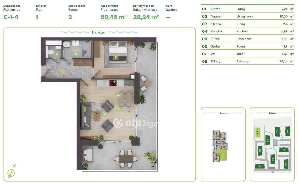 Balaton Déli part, Balatonszemes, közvetlen vízparti, 65 m2 lakás eladó. Az ingatlan a Balaton egyik legszebb vízparti lakóparkjában, természetes zöld környezetben található. A környezettudatosan épült, panorámás kilátást nyújtó, modern épületek esztétikailag és a fenntarthatóság szempontjából is kiemelkedőek, egyszerre biztosítják a kényelmes otthont és a balatoni életstílust. A különböző lakástípusok lehetőséget adnak arra, hogy minden lakó megtalálja a számára tökéletes otthont, akár az Otthon Start Hitelprogram keretében is. A földszinti lakások terasszal és kertkapcsolattal rendelkeznek, az épületek felső emeletén penthouse lakás került kialakításra. Ehhez az 51 m2-es 1. emeleti lakáshoz kis tároló és egy 28 m2-es erkély tartozik. A lakópark nem csak elhelyezkedése miatt egyedi, minden egyes lakás a legújabb intelligens technológiával, magas minőségű és igényes alapanyagokkal, prémium extrákkal kerül kialakításra. Egyszerre komfortosak és energiahatékonyak: elektromos redőnyök, szúnyogháló, egyedileg vezérelhető hőszivattyús, fan-coilos hűtési és fűtési rendszer, okosotthon rendszer, beléptető rendszer, riasztórendszer. Az ingatlan értékét növelik a következő szolgáltatások: a területen kialakított gondnoki, üzemeltetési iroda; zöldterületbe illesztett játszótér; zárt, privát vízpart több, mint 130 méteren; partmenti stég; közel 120 m2 vízfelületű strandmedence 16 m2-es gyermekpancsolóval; automata öntözőhálózat a lakóépületek közötti zöldfelületek öntözésére. OTP Ingatlanpont és Pénzügyi Pont irodánk teljeskörű támogatást nyújt az ingatlan kiválasztásával, megvételével, biztosításával és finanszírozásával, akár egyedi kedvezményes hitelekkel, befektetési lehetőségekkel kapcsolatban is. Bővebb információért keressen telefonon!
