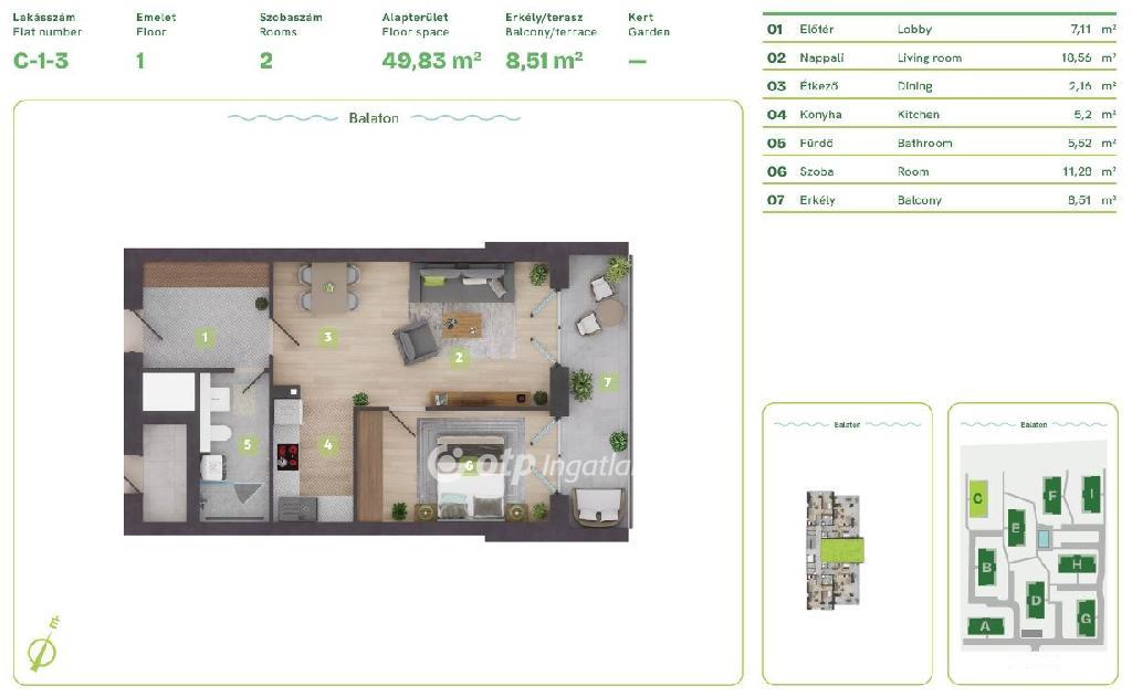 Balaton Déli part, Balatonszemes, közvetlen vízparti, 54 m2 lakás eladó. Az ingatlan a Balaton egyik legszebb vízparti lakóparkjában, természetes zöld környezetben található. A környezettudatosan épült, panorámás kilátást nyújtó, modern épületek esztétikailag és a fenntarthatóság szempontjából is kiemelkedőek, egyszerre biztosítják a kényelmes otthont és a balatoni életstílust. A különböző lakástípusok lehetőséget adnak arra, hogy minden lakó megtalálja a számára tökéletes otthont, akár az Otthon Start Hitelprogram keretében is. A földszinti lakások terasszal és kertkapcsolattal rendelkeznek, az épületek felső emeletén penthouse lakás került kialakításra. Ehhez az 50 m2-es 1. emeleti lakáshoz kis tároló és egy 9 m2-es erkély tartozik. A lakópark nem csak elhelyezkedése miatt egyedi, minden egyes lakás a legújabb intelligens technológiával, magas minőségű és igényes alapanyagokkal, prémium extrákkal kerül kialakításra. Egyszerre komfortosak és energiahatékonyak: elektromos redőnyök, szúnyogháló, egyedileg vezérelhető hőszivattyús, fan-coilos hűtési és fűtési rendszer, okosotthon rendszer, beléptető rendszer, riasztórendszer. Az ingatlan értékét növelik a következő szolgáltatások: a területen kialakított gondnoki, üzemeltetési iroda; zöldterületbe illesztett játszótér; zárt, privát vízpart több, mint 130 méteren; partmenti stég; közel 120 m2 vízfelületű strandmedence 16 m2-es gyermekpancsolóval; automata öntözőhálózat a lakóépületek közötti zöldfelületek öntözésére. OTP Ingatlanpont és Pénzügyi Pont irodánk teljeskörű támogatást nyújt az ingatlan kiválasztásával, megvételével, biztosításával és finanszírozásával, akár egyedi kedvezményes hitelekkel, befektetési lehetőségekkel kapcsolatban is. Bővebb információért keressen telefonon!