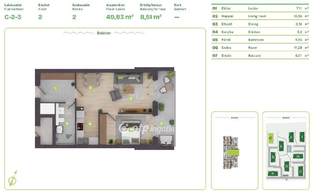 Balaton Déli part, Balatonszemes, közvetlen vízparti, 54 m2 lakás eladó. Az ingatlan a Balaton egyik legszebb vízparti lakóparkjában, természetes zöld környezetben található. A környezettudatosan épült, panorámás kilátást nyújtó, modern épületek esztétikailag és a fenntarthatóság szempontjából is kiemelkedőek, egyszerre biztosítják a kényelmes otthont és a balatoni életstílust. A különböző lakástípusok lehetőséget adnak arra, hogy minden lakó megtalálja a számára tökéletes otthont, akár az Otthon Start Hitelprogram keretében is. A földszinti lakások terasszal és kertkapcsolattal rendelkeznek, az épületek felső emeletén penthouse lakás került kialakításra. Ehhez az 50 m2-es 2. emeleti lakáshoz kis tároló és egy 9 m2-es erkély tartozik. A lakópark nem csak elhelyezkedése miatt egyedi, minden egyes lakás a legújabb intelligens technológiával, magas minőségű és igényes alapanyagokkal, prémium extrákkal kerül kialakításra. Egyszerre komfortosak és energiahatékonyak: elektromos redőnyök, szúnyogháló, egyedileg vezérelhető hőszivattyús, fan-coilos hűtési és fűtési rendszer, okosotthon rendszer, beléptető rendszer, riasztórendszer. Az ingatlan értékét növelik a következő szolgáltatások: a területen kialakított gondnoki, üzemeltetési iroda; zöldterületbe illesztett játszótér; zárt, privát vízpart több, mint 130 méteren; partmenti stég; közel 120 m2 vízfelületű strandmedence 16 m2-es gyermekpancsolóval; automata öntözőhálózat a lakóépületek közötti zöldfelületek öntözésére. OTP Ingatlanpont és Pénzügyi Pont irodánk teljeskörű támogatást nyújt az ingatlan kiválasztásával, megvételével, biztosításával és finanszírozásával, akár egyedi kedvezményes hitelekkel, befektetési lehetőségekkel kapcsolatban is. Bővebb információért keressen telefonon!