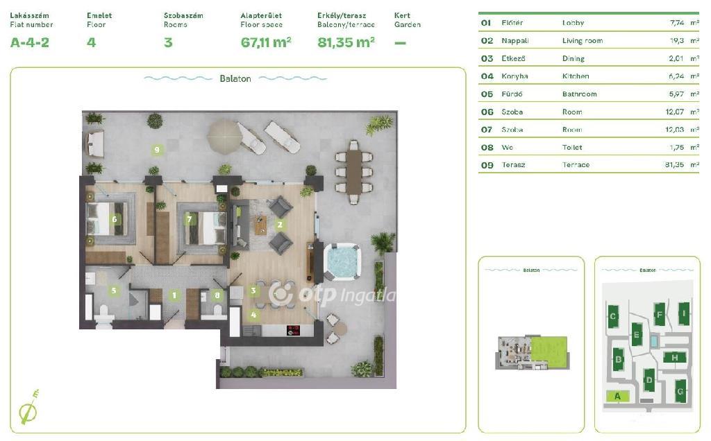 Balaton Déli part, Balatonszemes, közvetlen vízparti, 108 m2 panorámás penthouse lakás eladó. Az ingatlan a Balaton egyik legszebb vízparti lakóparkjában, természetes zöld környezetben található. A környezettudatosan épült, panorámás kilátást nyújtó, modern épületek esztétikailag és a fenntarthatóság szempontjából is kiemelkedőek, egyszerre biztosítják a kényelmes otthont és a balatoni életstílust. A különböző lakástípusok lehetőséget adnak arra, hogy minden lakó megtalálja a számára tökéletes otthont, akár az Otthon Start Hitelprogram keretében is. A földszinti lakások terasszal és kertkapcsolattal rendelkeznek, az épületek felső emeletén penthouse lakás került kialakításra. Ehhez a 67 m2-es, balatoni panorámás 4. emeleti lakáshoz kis tároló és egy 81 m2-es tetőterasz tartozik. A lakópark nem csak elhelyezkedése miatt egyedi, minden egyes lakás a legújabb intelligens technológiával, magas minőségű és igényes alapanyagokkal, prémium extrákkal kerül kialakításra. Egyszerre komfortosak és energiahatékonyak: elektromos redőnyök, szúnyogháló, egyedileg vezérelhető hőszivattyús, fan-coilos hűtési és fűtési rendszer, okosotthon rendszer, beléptető rendszer, riasztórendszer. Az ingatlan értékét növelik a következő szolgáltatások: a területen kialakított gondnoki, üzemeltetési iroda; zöldterületbe illesztett játszótér; zárt, privát vízpart több, mint 130 méteren; partmenti stég; közel 120 m2 vízfelületű strandmedence 16 m2-es gyermekpancsolóval; automata öntözőhálózat a lakóépületek közötti zöldfelületek öntözésére. OTP Ingatlanpont és Pénzügyi Pont irodánk teljeskörű támogatást nyújt az ingatlan kiválasztásával, megvételével, biztosításával és finanszírozásával, akár egyedi kedvezményes hitelekkel, befektetési lehetőségekkel kapcsolatban is. Bővebb információért keressen telefonon!