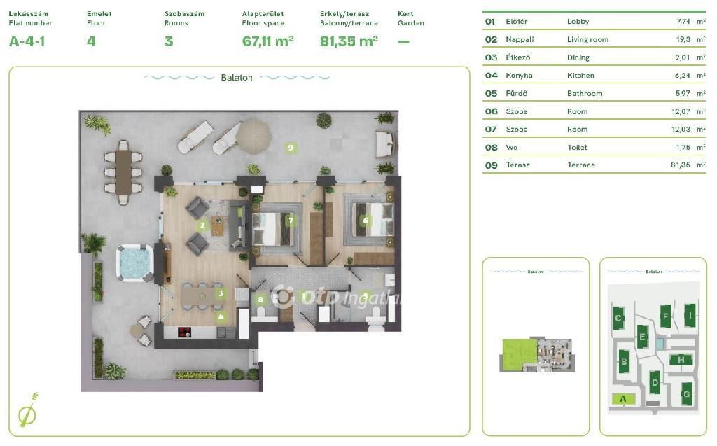 Balaton Déli part, Balatonszemes, közvetlen vízparti, 108 m2 panorámás penthouse lakás eladó. Az ingatlan a Balaton egyik legszebb vízparti lakóparkjában, természetes zöld környezetben található. A környezettudatosan épült, panorámás kilátást nyújtó, modern épületek esztétikailag és a fenntarthatóság szempontjából is kiemelkedőek, egyszerre biztosítják a kényelmes otthont és a balatoni életstílust. A különböző lakástípusok lehetőséget adnak arra, hogy minden lakó megtalálja a számára tökéletes otthont, akár az Otthon Start Hitelprogram keretében is. A földszinti lakások terasszal és kertkapcsolattal rendelkeznek, az épületek felső emeletén penthouse lakás került kialakításra. Ehhez a 67 m2-es, balatoni panorámás 4. emeleti lakáshoz kis tároló és egy 81 m2-es tetőterasz tartozik. A lakópark nem csak elhelyezkedése miatt egyedi, minden egyes lakás a legújabb intelligens technológiával, magas minőségű és igényes alapanyagokkal, prémium extrákkal kerül kialakításra. Egyszerre komfortosak és energiahatékonyak: elektromos redőnyök, szúnyogháló, egyedileg vezérelhető hőszivattyús, fan-coilos hűtési és fűtési rendszer, okosotthon rendszer, beléptető rendszer, riasztórendszer. Az ingatlan értékét növelik a következő szolgáltatások: a területen kialakított gondnoki, üzemeltetési iroda; zöldterületbe illesztett játszótér; zárt, privát vízpart több, mint 130 méteren; partmenti stég; közel 120 m2 vízfelületű strandmedence 16 m2-es gyermekpancsolóval; automata öntözőhálózat a lakóépületek közötti zöldfelületek öntözésére. OTP Ingatlanpont és Pénzügyi Pont irodánk teljeskörű támogatást nyújt az ingatlan kiválasztásával, megvételével, biztosításával és finanszírozásával, akár egyedi kedvezményes hitelekkel, befektetési lehetőségekkel kapcsolatban is. Bővebb információért keressen telefonon!