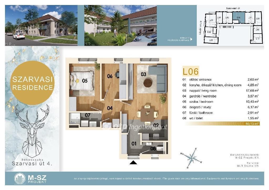 AZ EMELETI ALAPRAJZON LÁTHATÓ L06 JELÖLÉSŰ 50 m2 ALAPTERÜLETŰ LAKÁS, előtér (2,60 m2), konyha-étkező (4,80 m2), nappali (17,70 m2), gardrób (3,60 m2), szoba (10,40 m2), dolgozószoba (6,00 m2), épített zuhanyzós fürdőszoba (2,90 m2), wc (1,90 m2) kialakítású. A nappali és szoba, dolgozószoba, gardrób, laminált parketta, a többi helyiség kőporcelán padlólap burkolatú. A fűtés levegő-víz hőszivattyús rendszerű padlófűtés, a fürdőszobában törülközőszárító radiátor. A hűtés levegő-levegő hőszivattyús rendszerű, magas oldalfali beltéri egységgel.