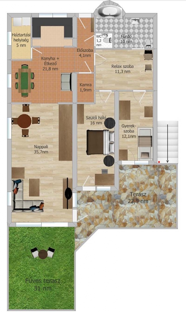 A 60 nm-es terasz egyik része füvesített, automata öntözőrendszerrel, akár jakuzzi telepítésére is alkalmas, igazi wellness-élményt nyújt.