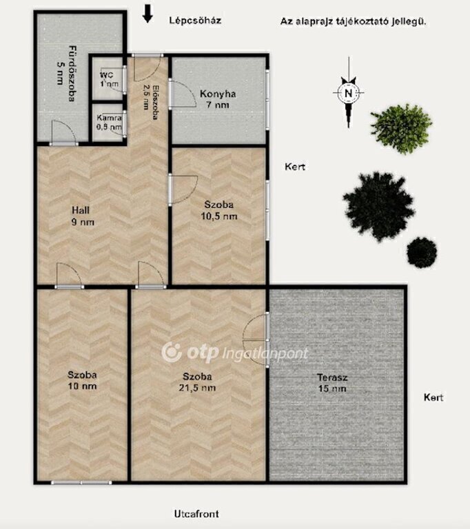 Kültér: 15 nm-es, kertre néző, beépíthető terasz