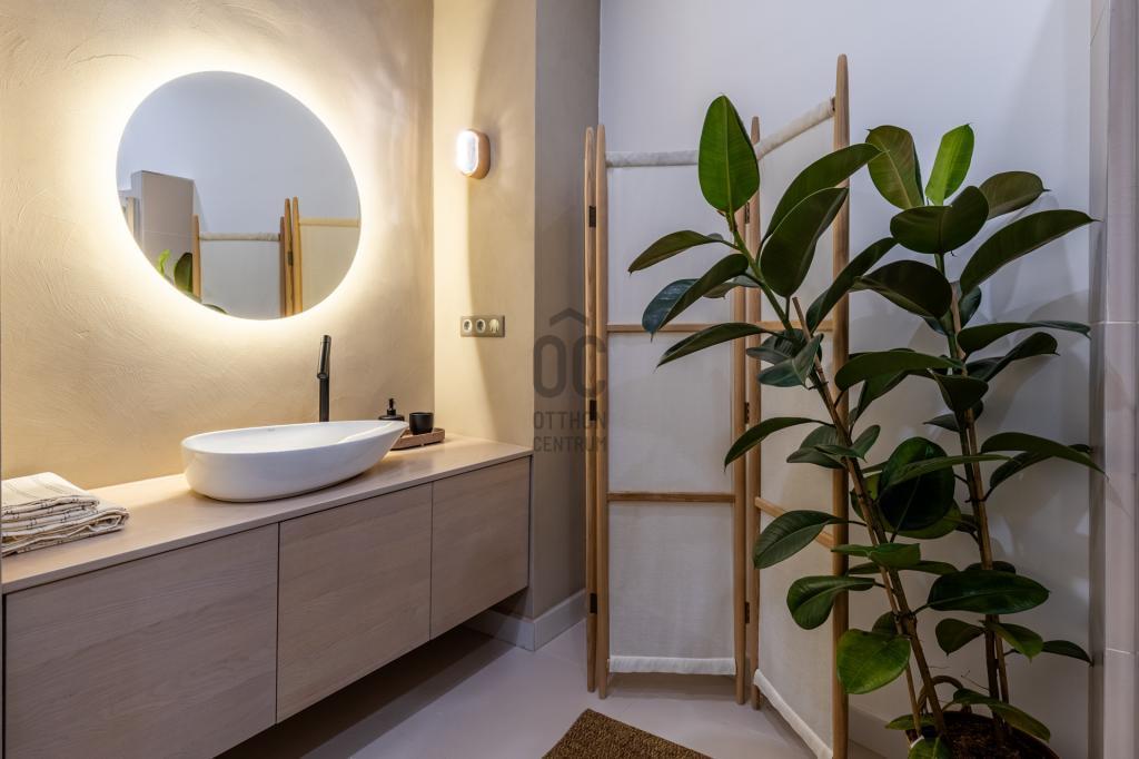 - A fürdőszoba modern márványhatású hidegburkolattal a többi helyiség elegáns és időtálló, halszálka mintában lerakott vinyl parkettával burkolt.