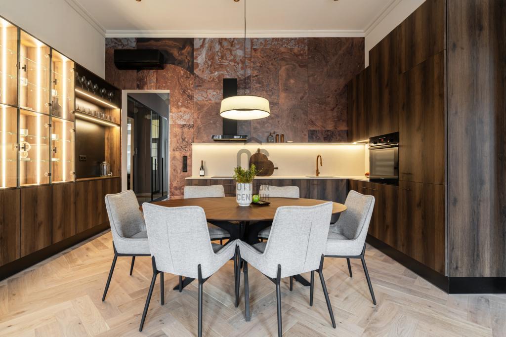 A lakberendező által megtervezett tér harmóniája, a természetes anyaghasználat és a modern technológia elegáns egységet alkotnak.