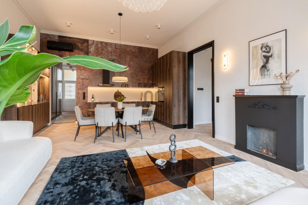 A tágas amerikai konyhás nappali központi élettérként szolgál, amelyet egyedi gyártású bútorok, tölgyfa parketta és bioetanol kandalló tesz különlegessé.